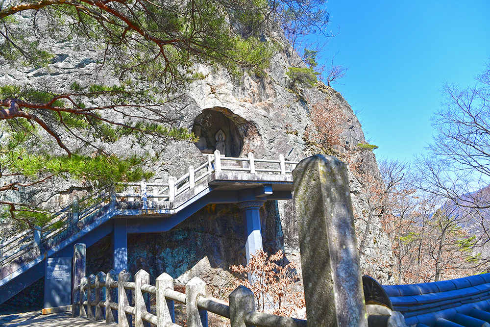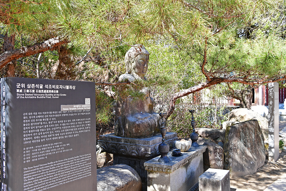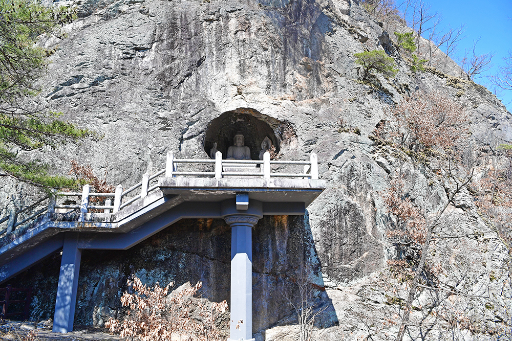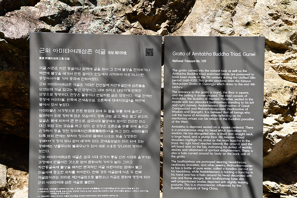 이어서 삼존석굴을 만납니다. 국보 제109호로 지정관리 중인 삼존석굴은 팔공산 절벽의 자연동굴에 만들어진 통일신라 초기의 석굴사원입니다. 이 석굴에는 700년경에 만들어진 삼존석불이 모셔져 있습니다. 경주 석굴암에 이어 두번째 석굴암이라는 의미로 '제2석굴암'이라 불렸지만, 정식 명칭은 '군위 아미타여래 삼존 석굴'입니다. 참고로 인공적으로 만들어진 경주 석굴보다도 연대가 100여년 더 앞선 답니다.ㅎ