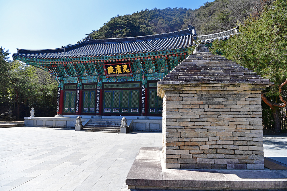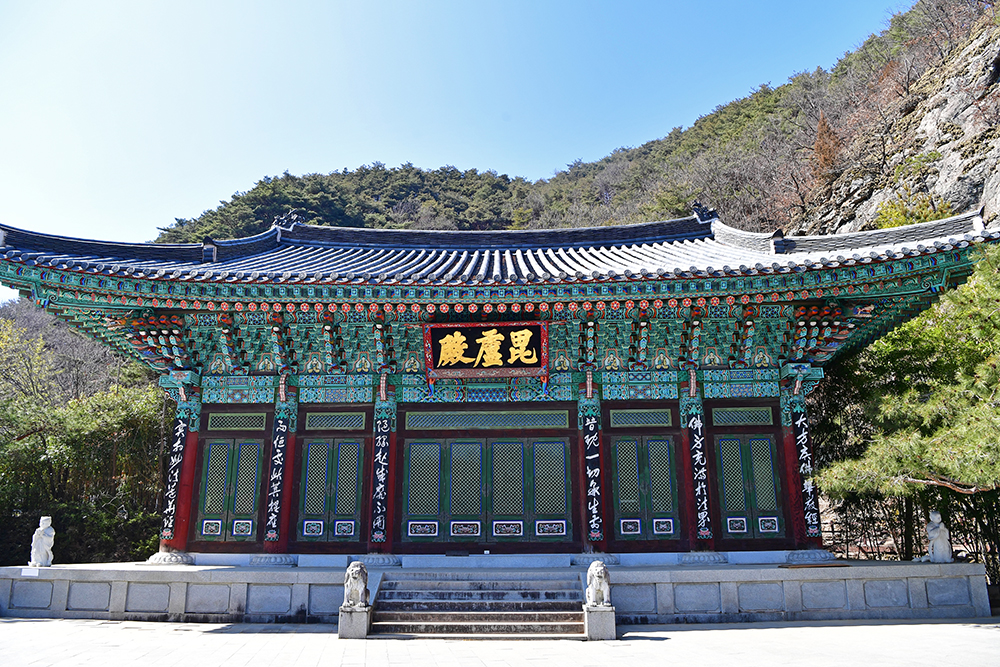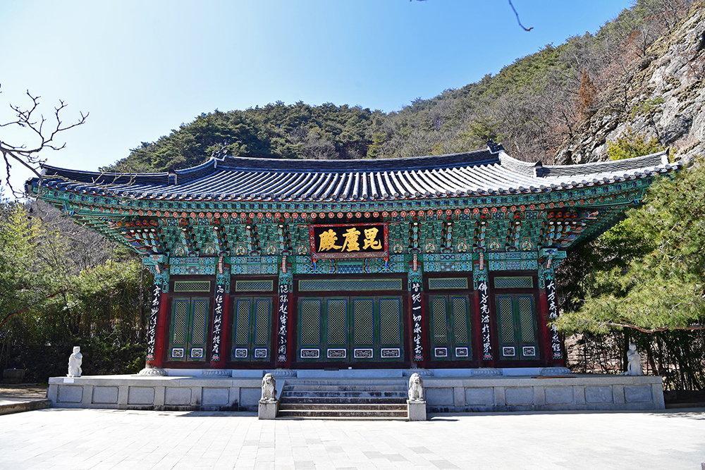 다음은 비로전 입니다. 비로자나불을 모신 법당으로 팔공산 석굴암의 대웅전 같은 곳입니다. 소나무와 어우러진 모습이 아름답습니다. 법당 출입구에서 보이는 불상의 모습이 아주 근엄해 보입니다. ㅎ