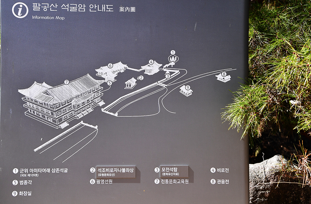 이어서 제2석굴암입니다. 먼저 석굴암 안내도를 보며 석굴과 가람의 배치를 살펴봤습니다. 안내도의 명칭은 '팔공산 석굴암 안내도' 입니다. 그렇습니다. 국보로 지정된 석굴을 관리하는 사찰이 '팔공산 석굴암'입니다.
