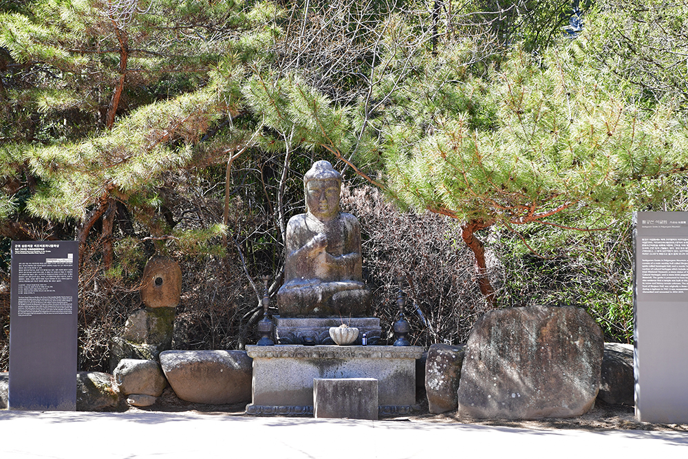 종무소를 지나면 석조비로자나불좌상이 나타납니다. 삼존 석불이 모셔진 이후인 9세기 경에 만들어졌다고 합니다. 소나무와 어우러진 석불상의 모습이 아주 인상적입니다. ㅎ