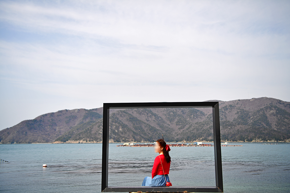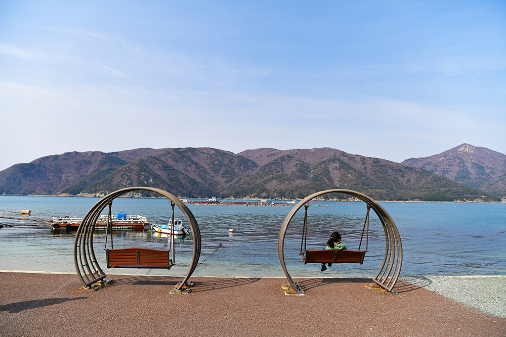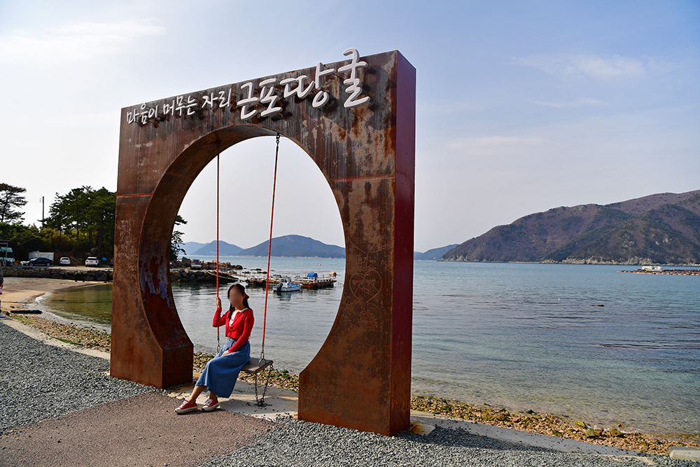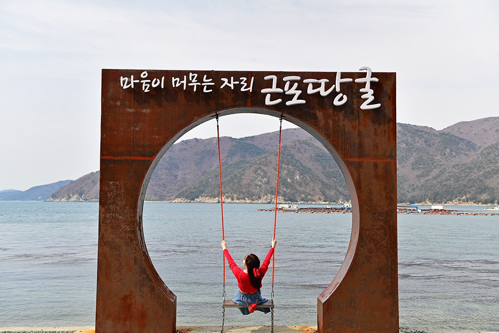 근포땅굴에서 재밌는 사진을 담은 후, 근포땅굴 앞으로 펼쳐지는 바다를 즐겨 봅니다. 해변가에는 포토존이 있습니다. 그네 모양의 포토존도 있습니다. 안전을 위해 당연히 움직이지 않습니다. 포토존에 씌여있는 '마음이 머무는 자리 근포땅굴'이라 표현이 너무 좋네요~