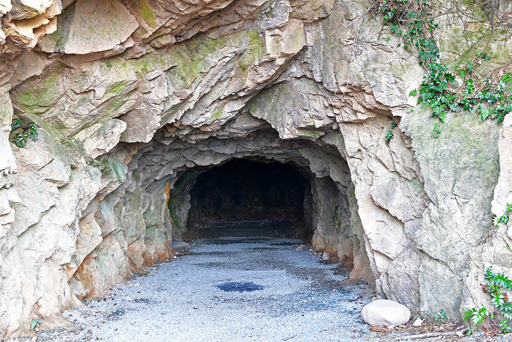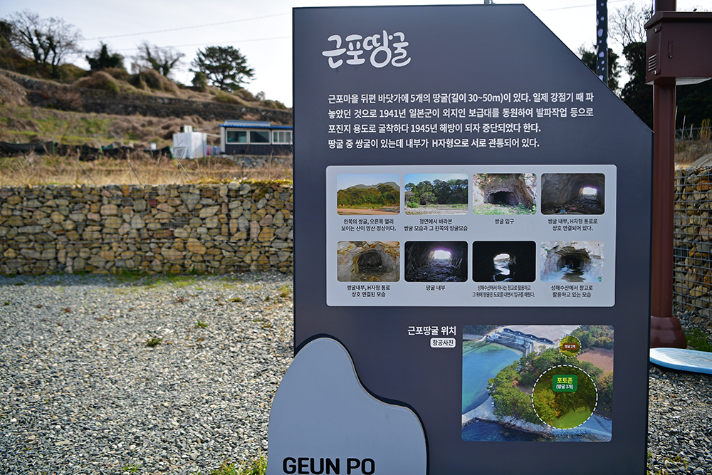 길을 따라 작은 언덕을 넘어가면 근포땅굴에 도착합니다. 우선 안내판을 읽어 봅니다. 근포땅굴은 일제 강점기 때 일본군 포진지 용도로 파놓았던 것으로, 1945년 해방이 되면서 중단되었다 합니다. 총 5개의 땅굴 중 일부는 육상 축양장 창고로 활용되고, 나머지는 개방하고 있습니다. 그 중 내부가 H자로 연결되어 있는 쌍굴이 오늘 가볼 곳입니다.ㅎ