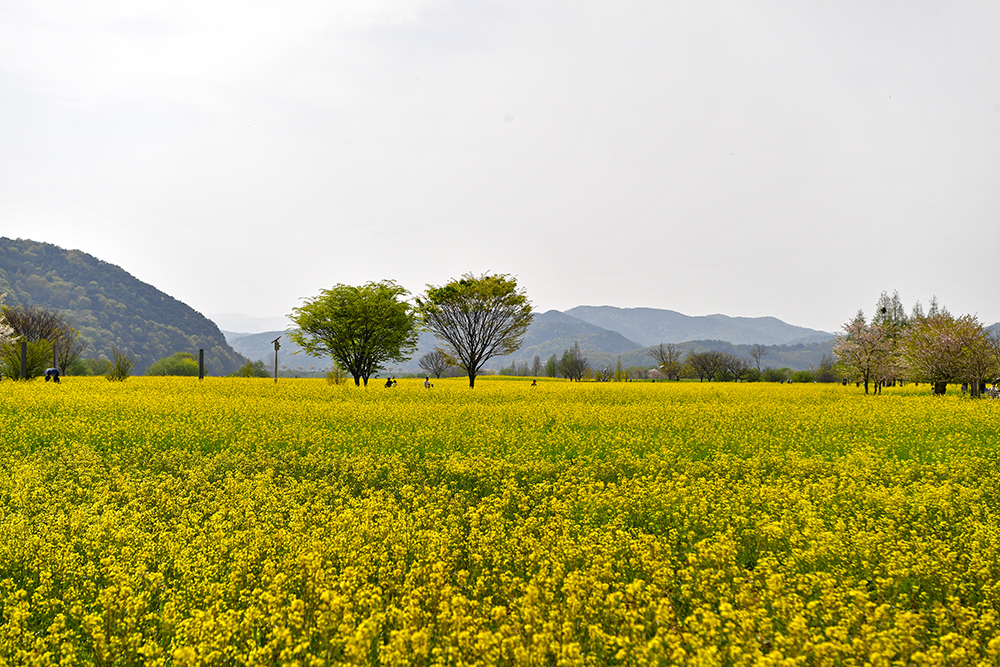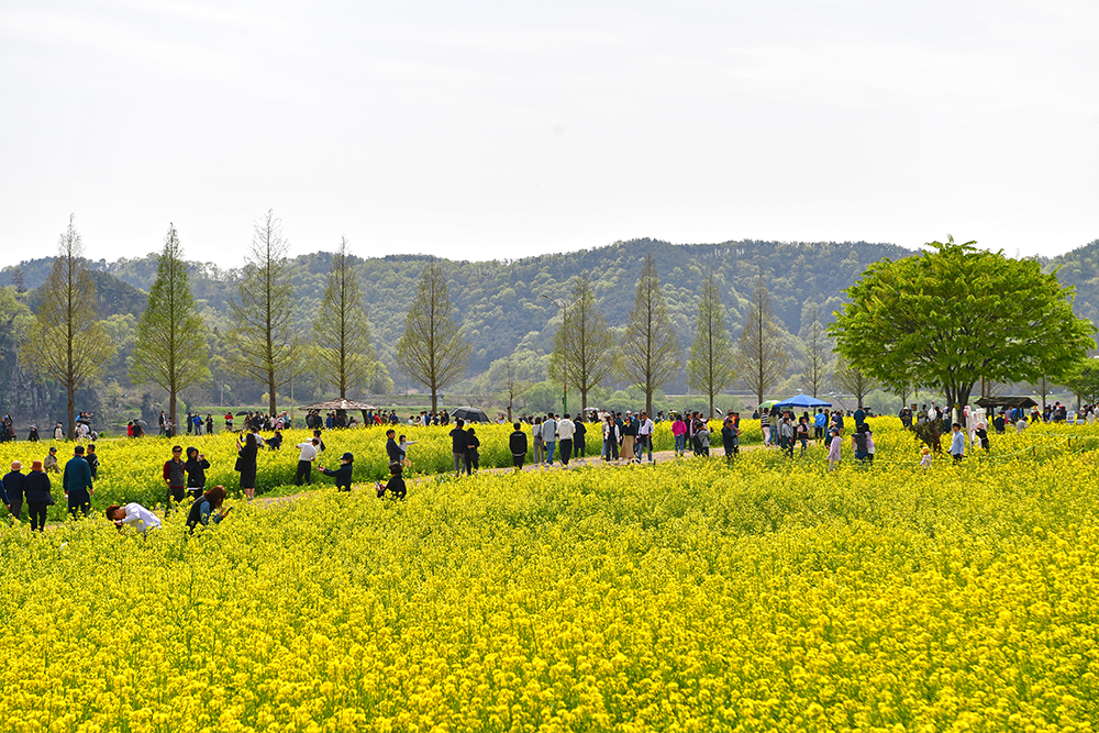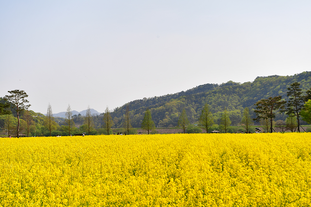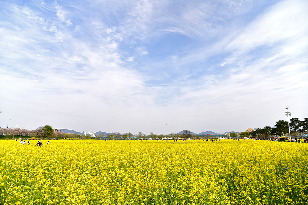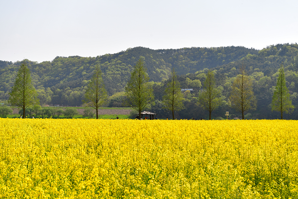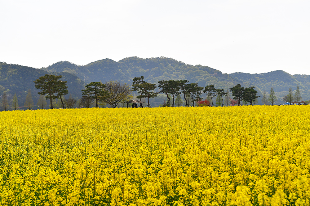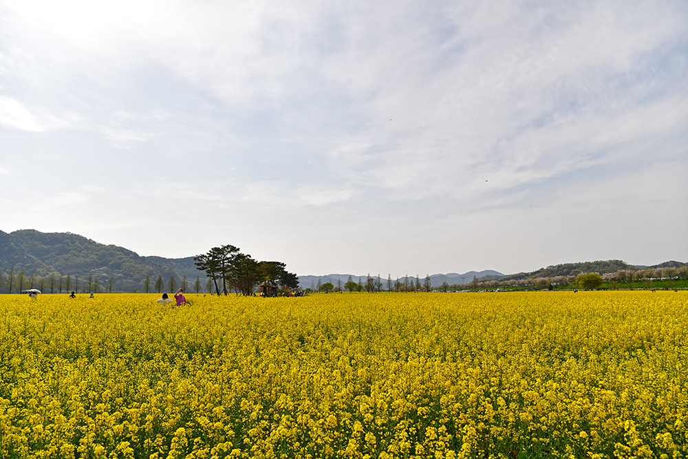 '창녕 낙동강유채축제장'은 전국 최대규모를 자랑합니다. 그래서 우선 드넓게 펼쳐진 유채꽃 단지를 즐길 요량입니다. 저 멀리 큰 벚꽃 나무가 보입니다. 넓은 유채꽃밭이 홀로 서있는 나무들.. 그리고 방문객들을 위해 설치해 놓은 정자등이 어우러진 멋진 모습을 연출합니다.
