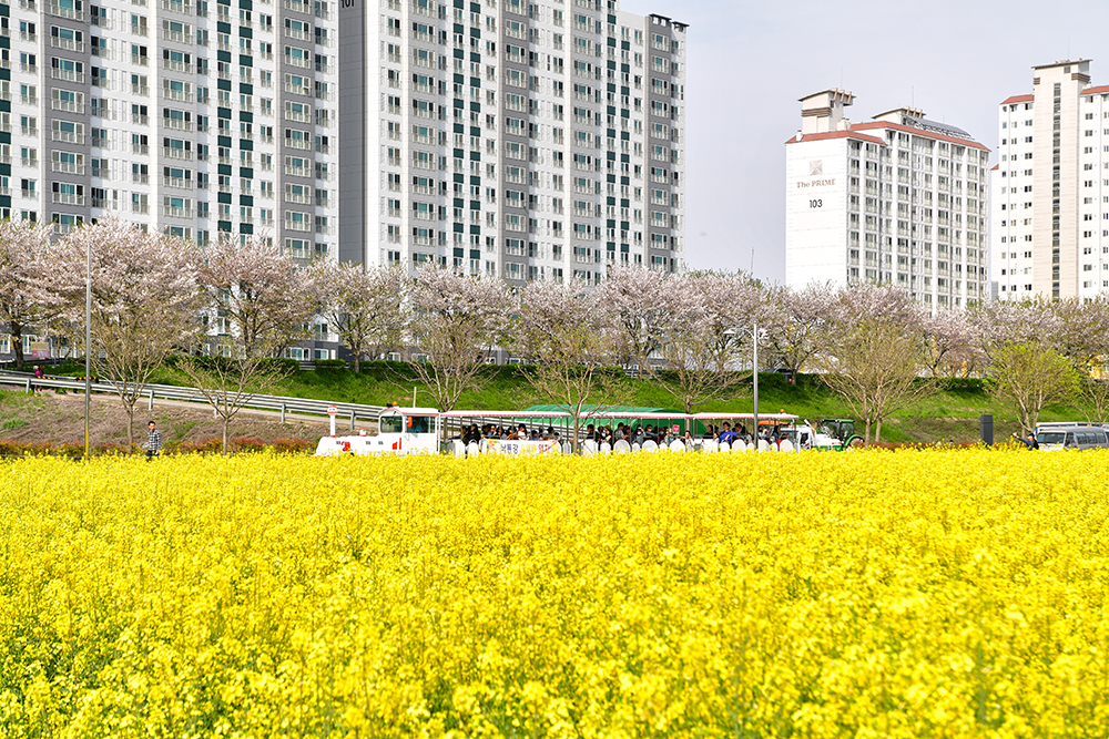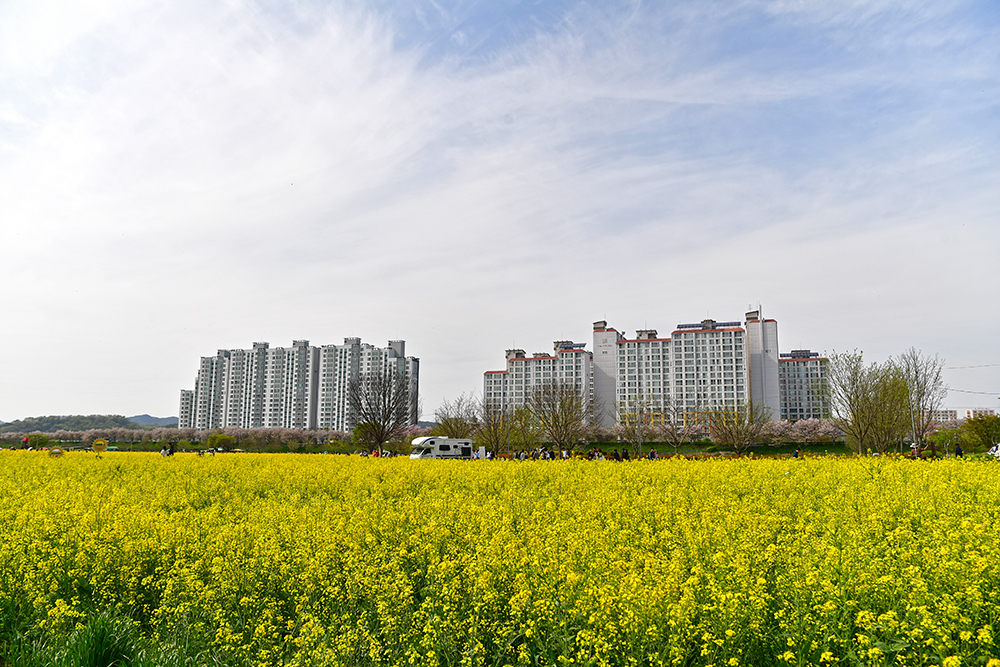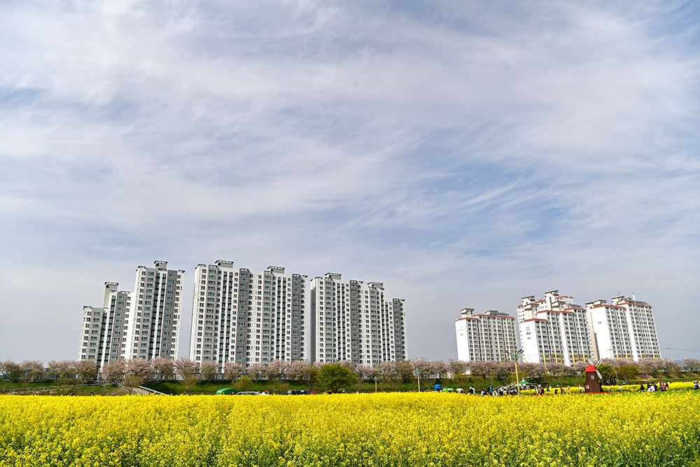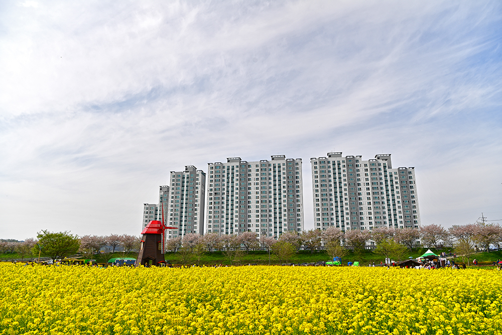축제장을 걷다보면 주변으로 아파트가 보입니다. 왼쪽은 '남지 이원웰스타 아파트'이고, 오른쪽은 '남지 동아더프라임아파트' 입니다. 이들 아파트를 배경으로 유채밭을 담아 봅니다. 제법 멋집니다.ㅎㅎ