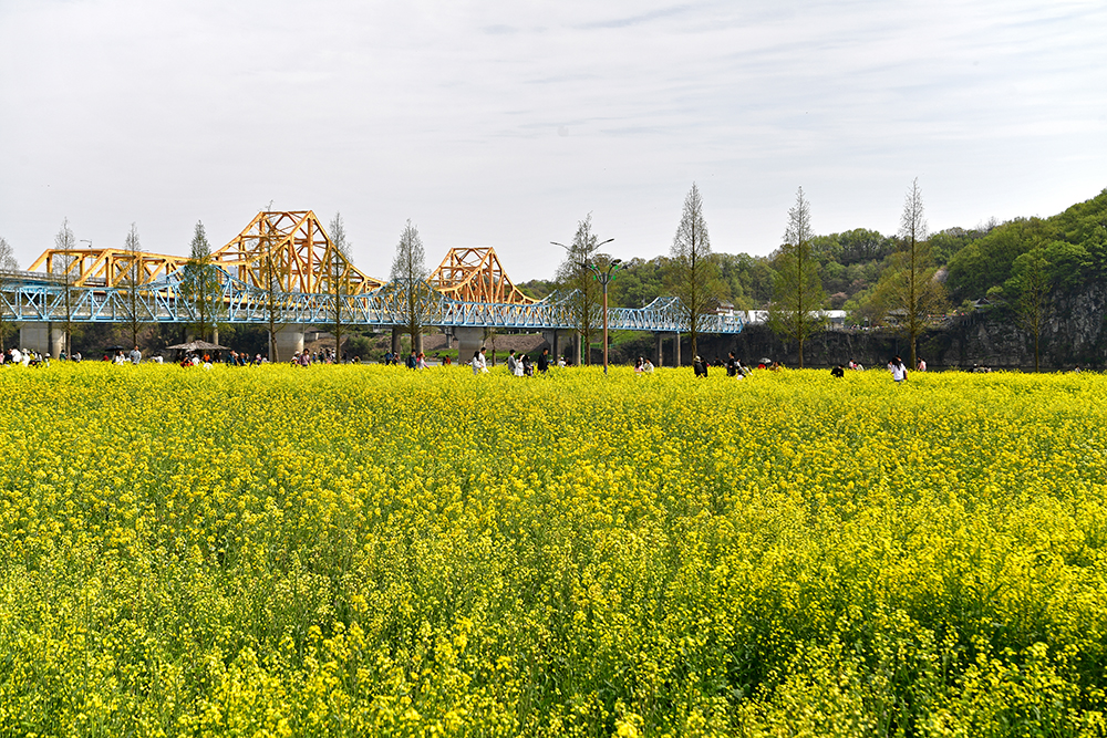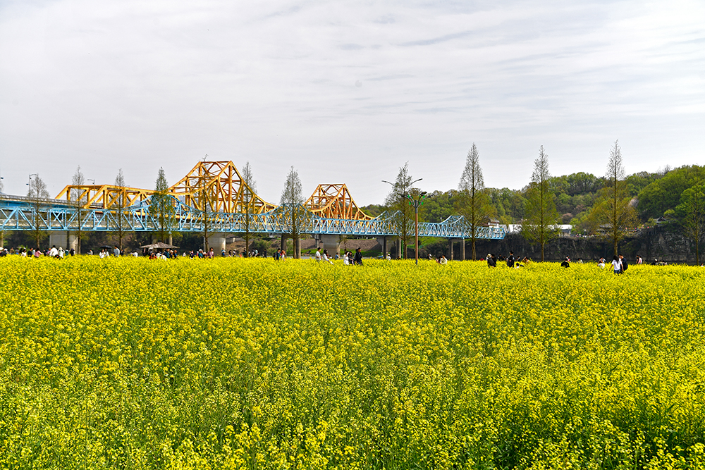 유채꽃 밭을 거닐어 봅니다. 입구에서 조금 지나면 창녕 남지읍의 명물인 '남지철교'를 볼수 있습니다. 주황색 빛을 띈 남지철교와 노란 유채꽃밭과 어우러진 모습이 인상적입니다. 살짝이 그 모습을 담아 봅니다. ㅎ