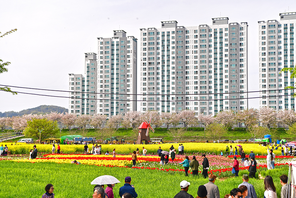 다음은 한반도 정원을 찾았습니다. 형형색색의 튜울립으로 한반도 모양의 정원을 만든 곳입니다. 튜울립과 노란 유채꽃, 파란 청보리와 풍차가 어우러진 모습이 너무 아름답습니다. 유채꽃 축제장에서 가장 아름다운 곳일텐데요, 방문객들이 가장 많이 찾는 곳입니다. ㅎ