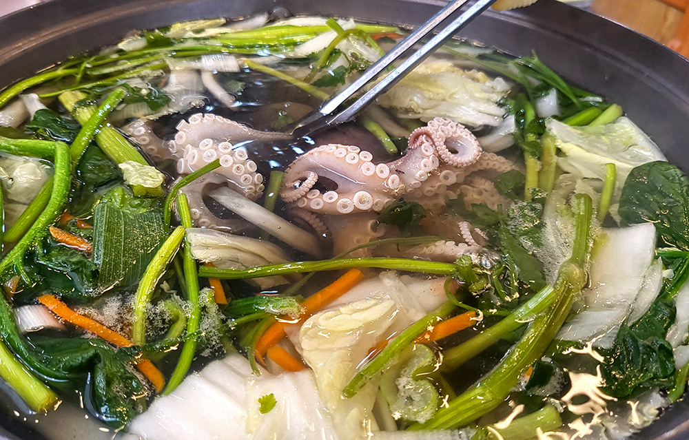 얼마후 쭈꾸미가 잘 익혀졌습니다. 맛있게 익혀진 쭈구미를 가위로 잘라서 먹으면 됩니다. 근데 머리를 살짝 잘라보니 흰 알갱이 뭉치가 나옵니다. 소위 '쌀밥'이라고 하는 '쭈꾸미 알'입니다. 제철 쭈꾸미에서만 맛볼 수 있습니다. 부드럽고 쫄깃쫄깃한 쭈구미를 맛있게 먹었습니다. 담백하고 뜨근한 샤브샤브 국물은 쌀쌀한 날씨를 잊게 만듭니다.