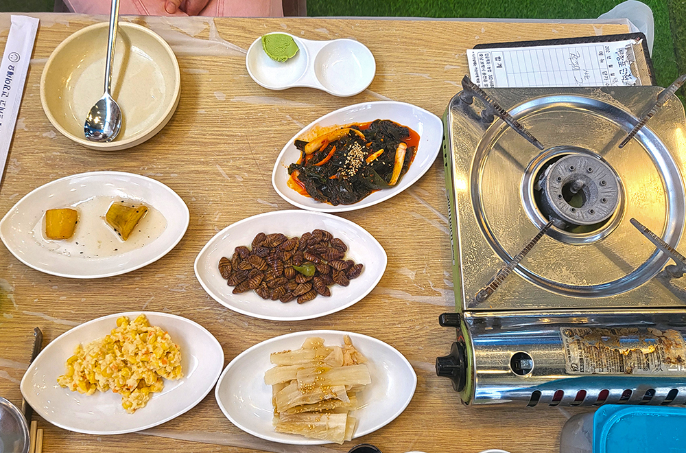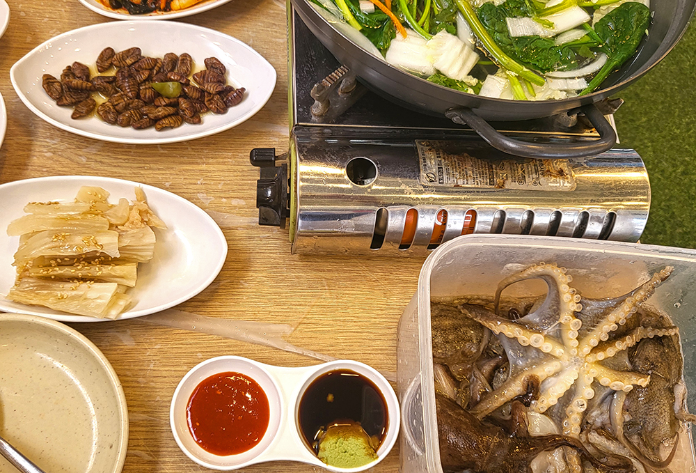 흐리고 좀 쌀쌀한 날씨인지라, '쭈구미 샤브'를 주문했습니다. 얼마 후 상이 차려집니다. 일반 가게와 별다를 것 없는 평범한 상차림 입니다. 쭈꾸미가 별도 통에 담겨 나옵니다. 꿈틀거리는 모습이 신기방기 합니다. ㅎㅎ