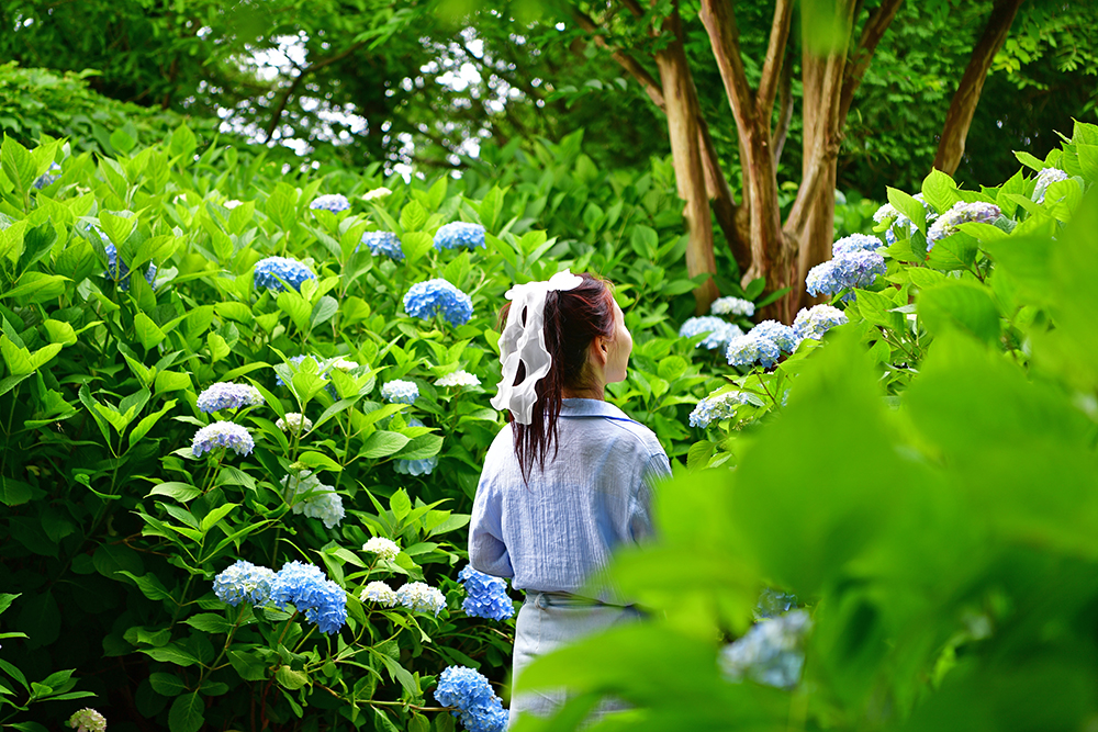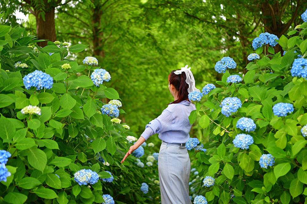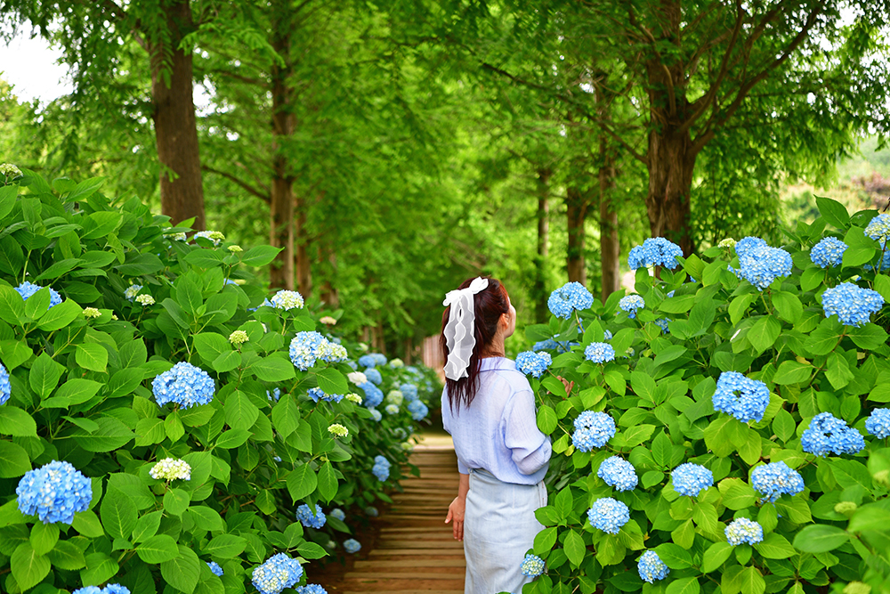 계속 수국길을 따라 전망대를 향해 걷다가 메타세콰이어 나무가 길게 늘어서 길을 만납니다. 길 양쪽에 있는 메타세콰이어 나무 아래에 아름다운 수국이 피어있습니다. 파란 수국과 어우러진 모습이 너무 멋집니다. 마침 주변에 방문객들도 없습니다.