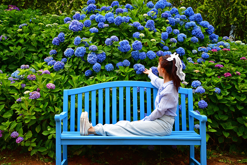 파란 대문의 '어린왕자펜션' 앞으로 수국길이 이어집니다. 이 코스가 이 곳의 메인인 듯 합니다. 사진 포인터가 여러군데 있습니다. 먼저 나무의자가 있는 곳에서 파란 수국과 함께 즐거운 시간을 가져 봅니다. ㅎ