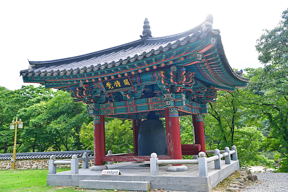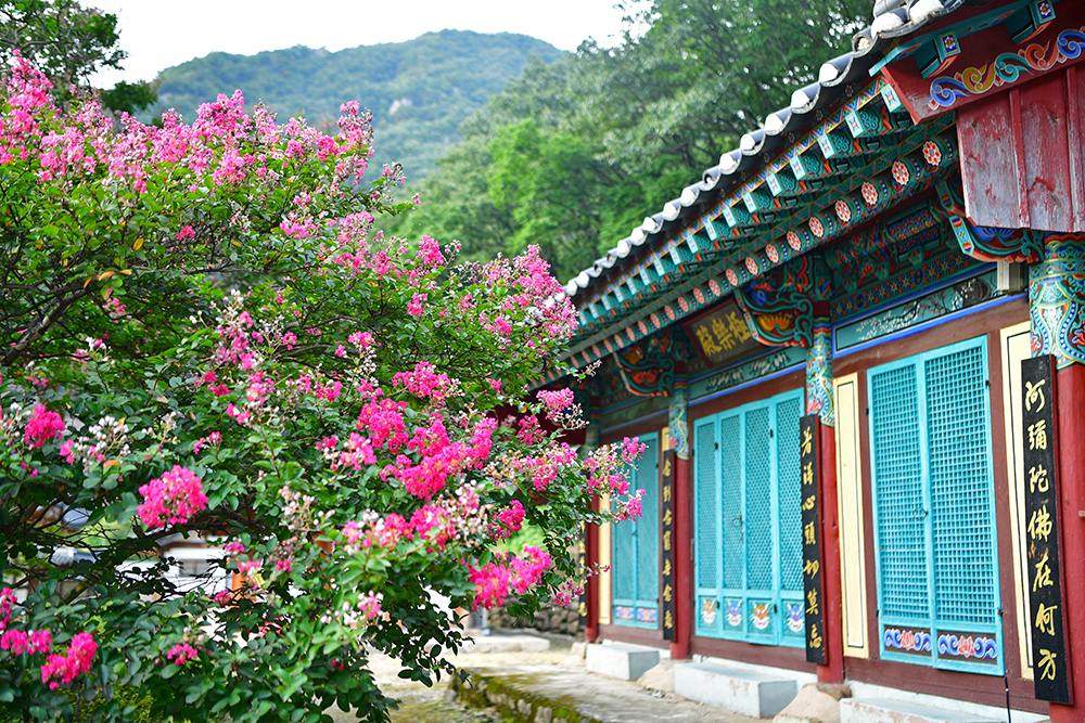 삼층 석탑 뒤편의 극락전을 살펴 봅니다. 근래 새로한 탓인지 단청 상태가 참 강렬합니다. 아직까지 피어있는 배롱나무 꽃과 어우러진 모습이 참 아름답습니다.