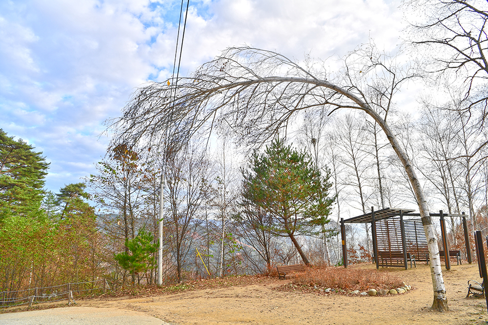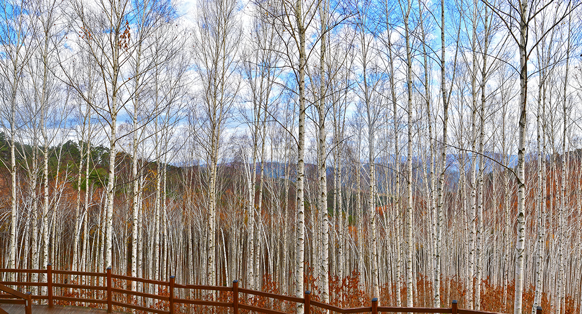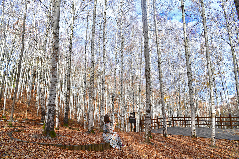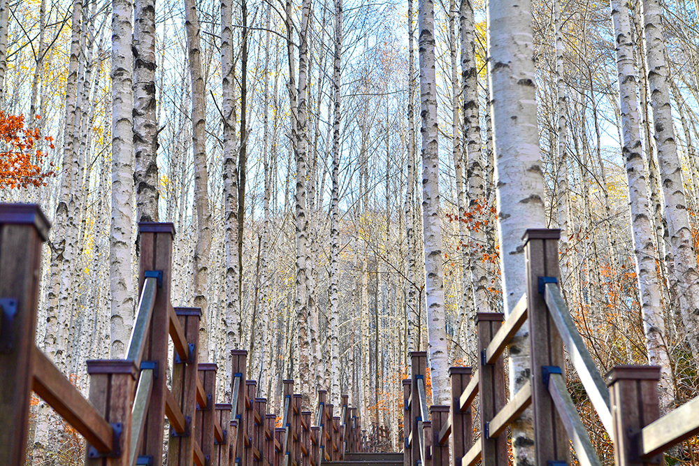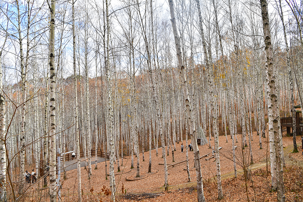 자작나무 숲 전망대에 도착했습니다. 전망대에서 보니, 20년 이상 되는 자작나무가 빽빽하게 들어찬 숲이 펼쳐집니다. 하얀 줄기와 잎이 빛나는 모습이 마치 눈이 내린 것처럼 보입니다. 울긋불긋 물든 낙역송과 하늘을 향해 뻗은 하얀 자작나무 숲이 이국적인 풍취를 느끼게 합니다. ㅎ