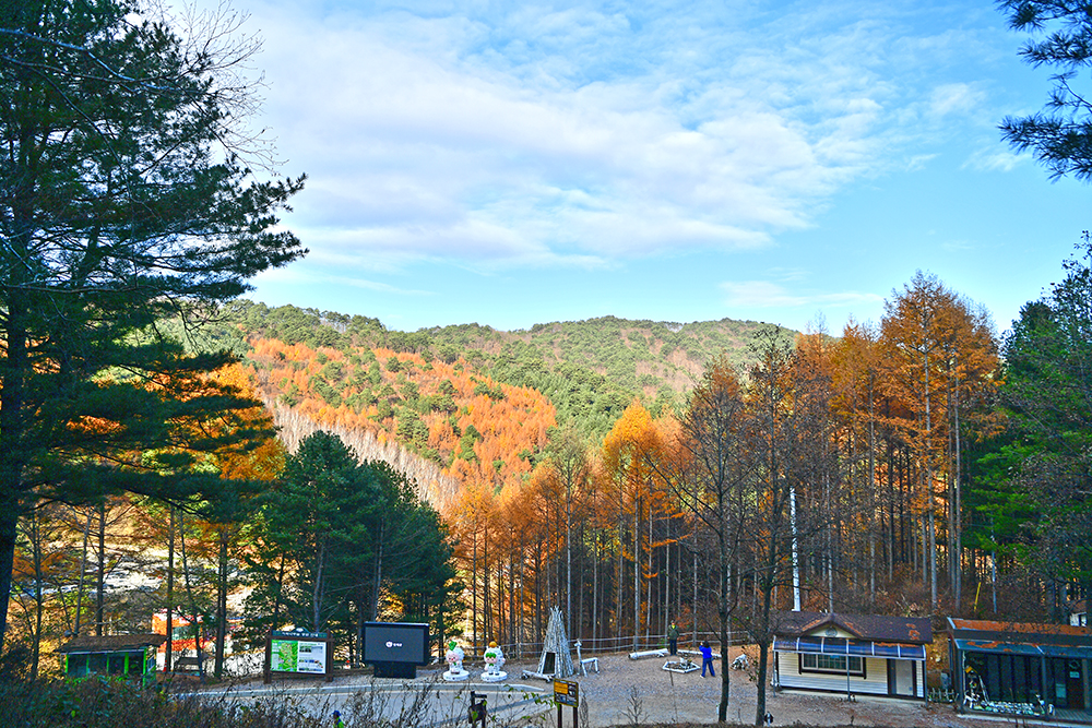 원정임도(윗길)을 통해 정상으로 향합니다. 아랫길을 통해 정상까지 갈수 있지만, 윗길로 가는 것이 훨씬 수월합니다. 데크길이 잘 정비되어 있어 걷기도 편합니다. 임도를 걷아보니 주황빛으로 예쁘게 물든 낙엽송이 눈에 들어옵니다. 마치 메타쉐쿼이아 처럼 보이는 것이 아름답습니다. ㅎ