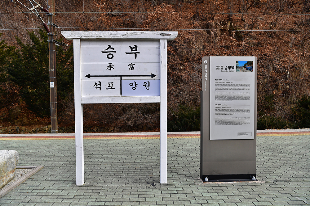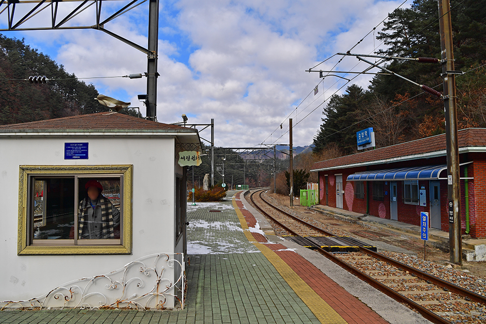 얼마간의 운행을 마친 후 협곡열차는 잠시 정차를 하며 쉬어갑니다. 1956년 영암선 개통과 함께 문을 연 '승부역' 입니다. 20여년간 승부역에서 근무했던 한 역무원이 역사 담벼락에 쓴 유명한 시가 있습니다. "하늘도 세평이요, 꽃밭도 세평이나 영동의 상징이요, 수송의 동맥이다" 라는 시는 , 어느새 승부역을 가장 잘 표현하는 상징이 되었습니다. ㅎ