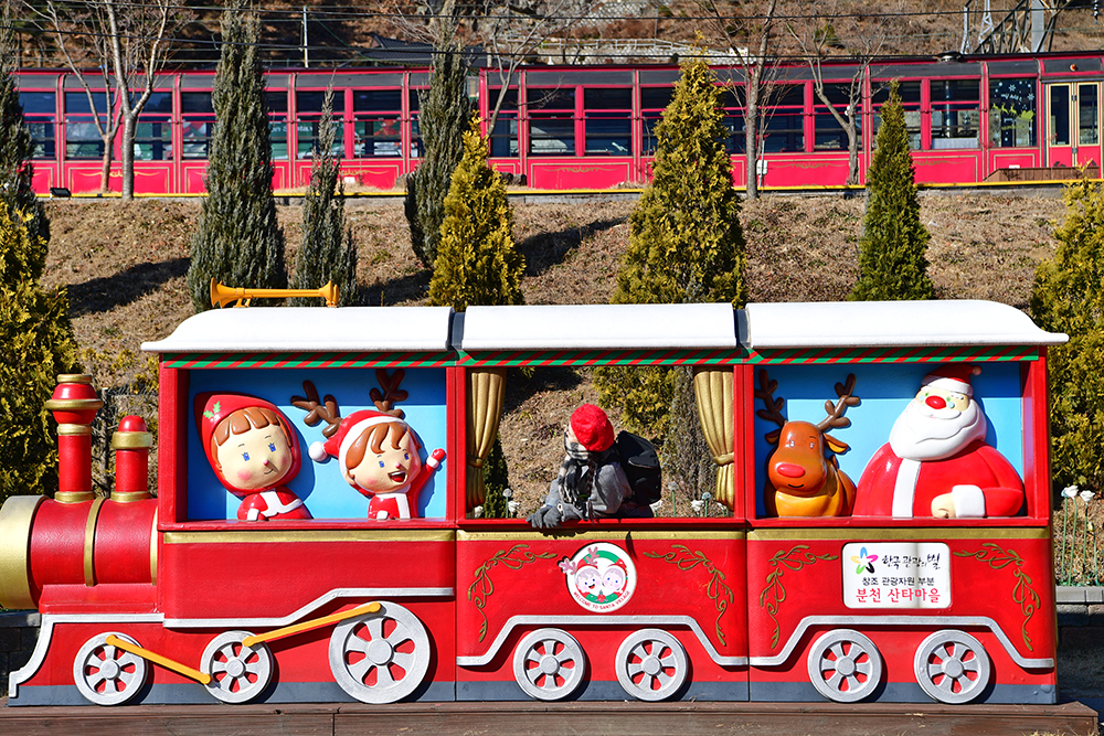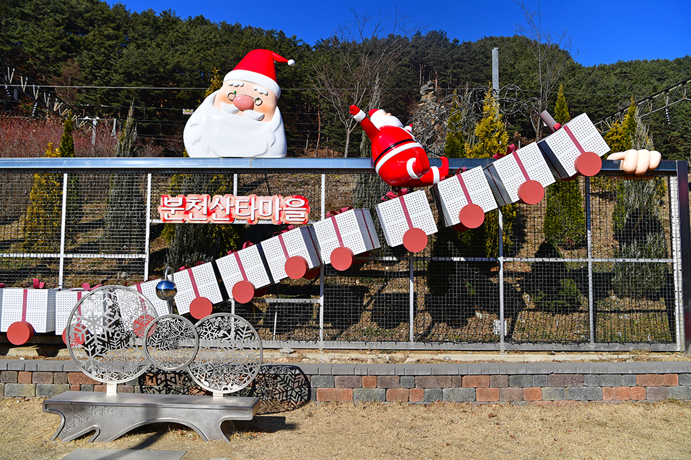 양원역을 거쳐 백두대간 협곡열차(V-트레인)는 종착지인 분천역에 도착했습니다. 분천역은 앞선 역보다는 사람들이 많습니다. 2014년부터 산타마을 역사로 조성해 왔기 때문입니다. 산타마을 답게, 여기저기에 설치되어 있는 각종 재밌는 조형물들을 즐겨 봅니다. ㅎ
