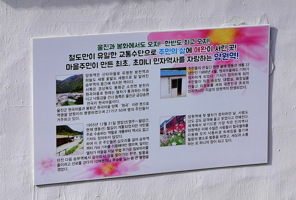 승부역을 출발해서 얼마간의 시간이 지나자 백두대간 협곡열차(V-트레인)는 다시한번 정차합니다. 한반도 최고의 오지로 꼽히는 '양원역' 입니다. 세계에서 가장 작은 민자역사라고 하는데, 양원역의 유래를 읽다보니 주민들의 삶에 대한 애환이 느껴집니다.