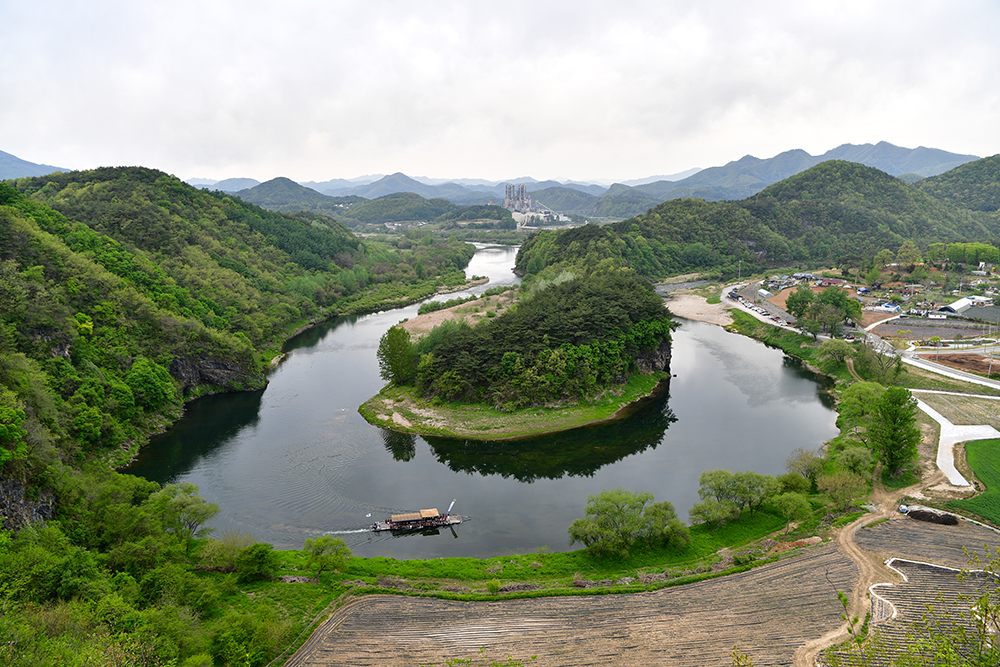 영월 한반도 지형은 삼면이 바다로 둘러싸인 모습을 강이 대신하여 흐르고 있습니다. 동쪽이 높고, 서쪽은 낮은 모습까지 완벽하게 우리나라 지형을 닮았습니다. 때마침 나룻배가 유유히 강을 따라 나아가고 있습니다. 그 모습을 담아 봅니다. ㅎ