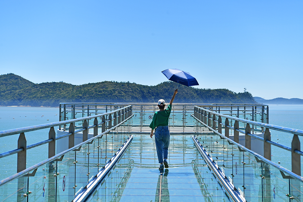 마침 방문객들이 잠시 뜸해진 틈을 타, 전속 모델을 내려보냈습니다. 뜨거운 햇볕을 피하려고 챙겨온 양산이 의외로 멋진 소품이 되어, 스카이워크 위에서의 분위기를 한층 살려 줍니다. 덕분에 바다와 어우러진 사진이 더 생동감있어 보입니다.