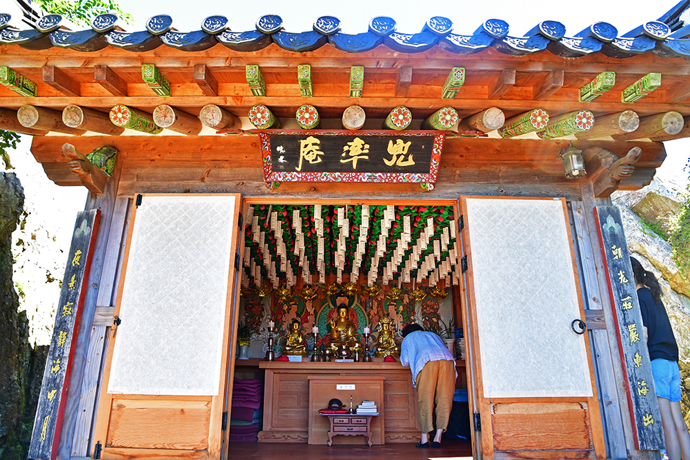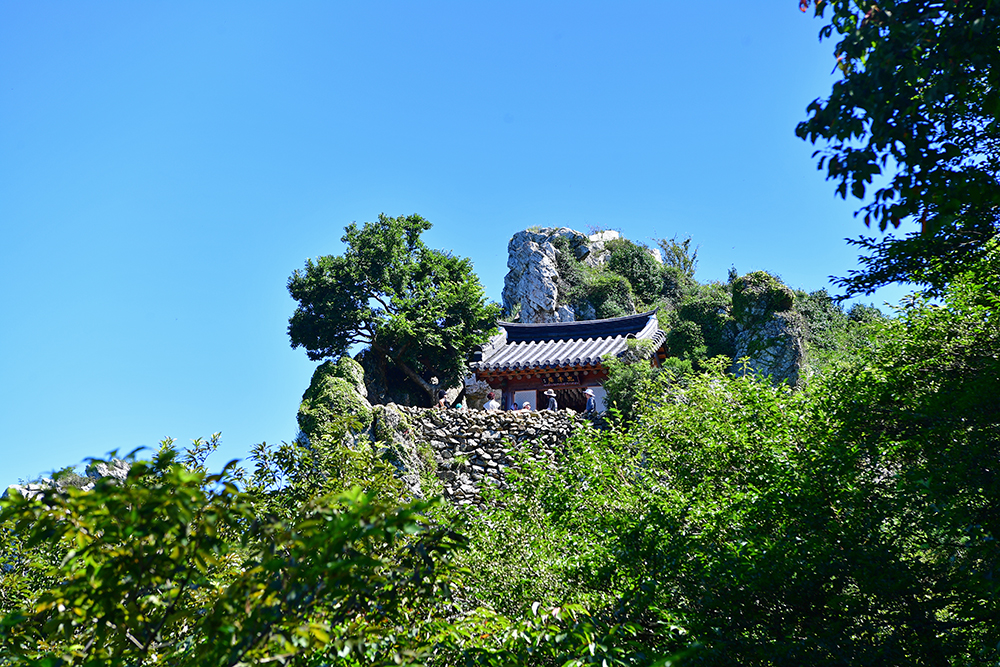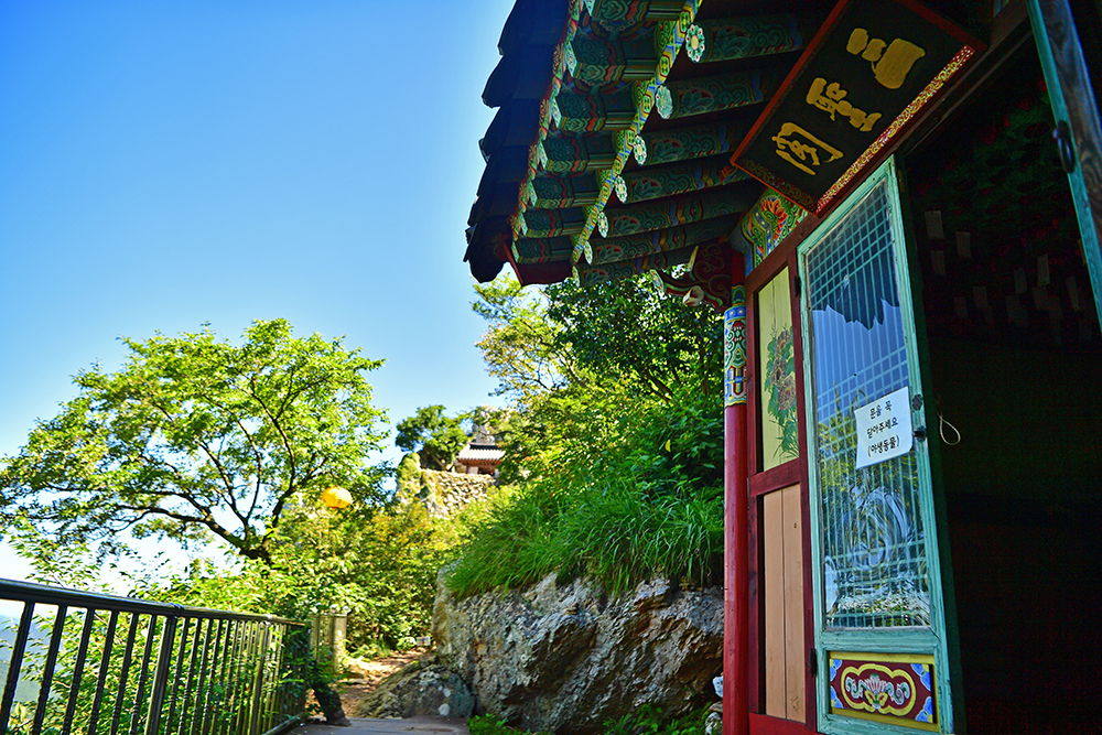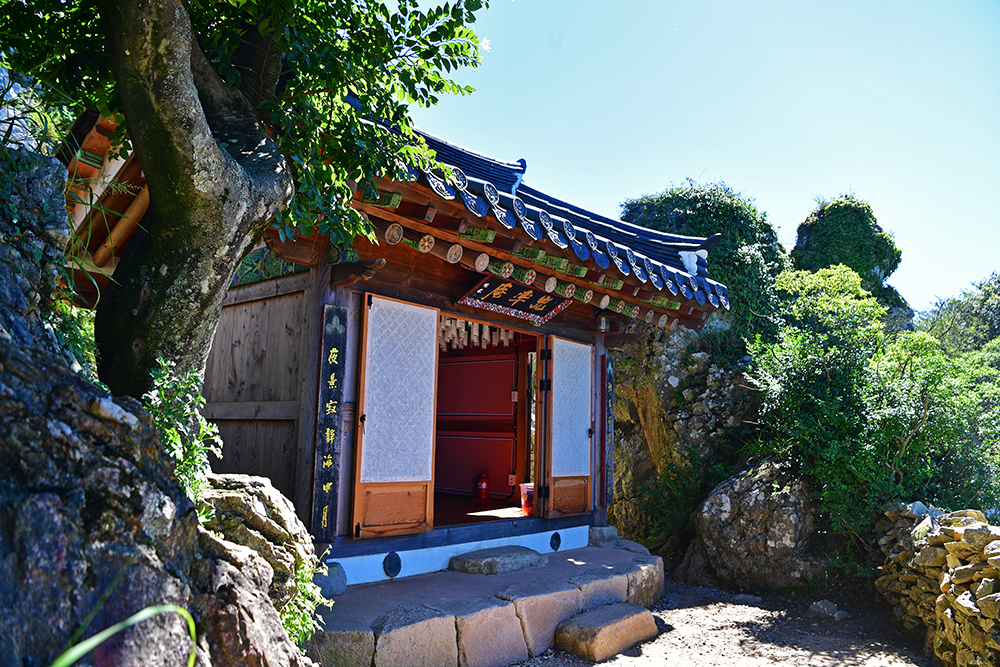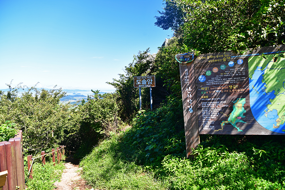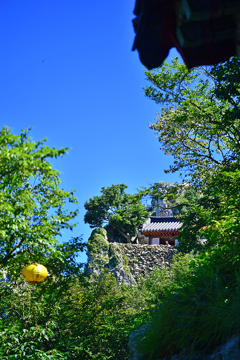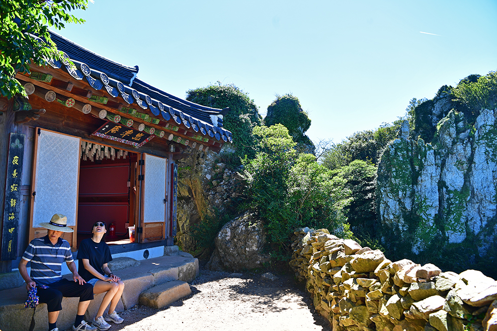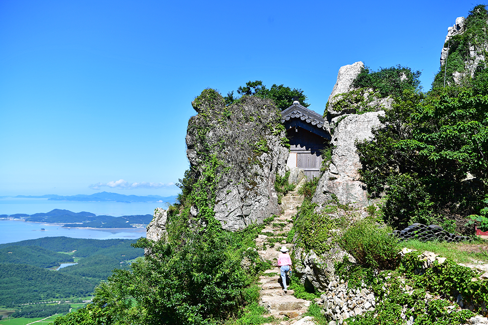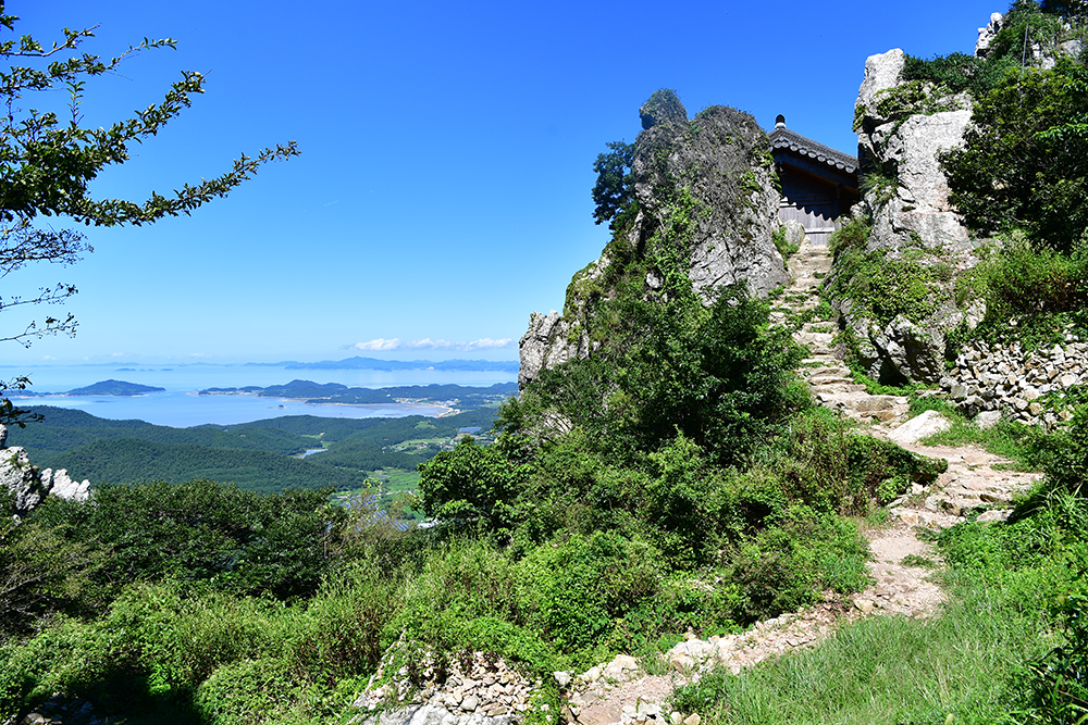 드디어 도솔암에 도착했습니다. 이 곳은 통일신라 말기에 의상대사가 창건한 천년 기도 도량입니다. 한때 명량해전에 패한 왜군에 의해 소실되었다가 2002년 복원된 암자입니다. 정상부에 구름이 걸린 날이면, 마치 구름 위에 떠있는 듯한 '선경의 세계'를 연출합니다. 아쉽게도 찾은 날은 맑고 쨍한 날씨라 그런 신비로운 장면을 만나지 못했지만, 도솔암으로 이어지는 계단 길은 그 자체로 선경의 세계에 오르는 길처럼 느껴졌습니다.