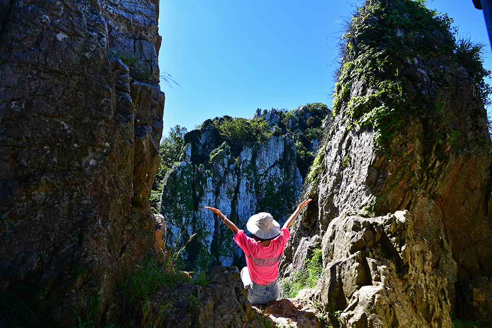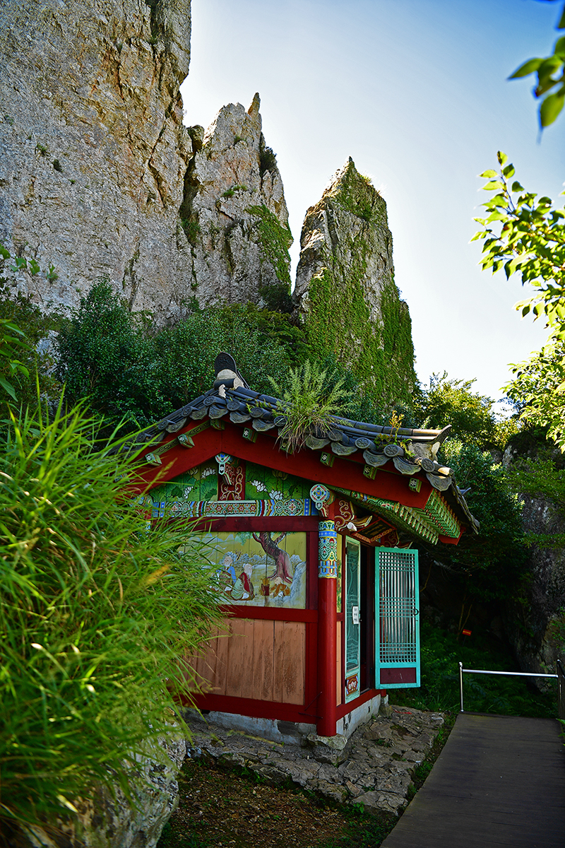 도솔암에서 아름다운 풍경과 함께 마음의 평안을 누린 뒤, 도솔암을 나서려는데 입구 양쪽에 떡하니 서있는 바위가 눈에 들어 왔습니다. 바위 사이에 앉아서 사진을 담으면 색다른 분위기가 나올 것 같습니다. 마치 중국 장가계의 골짜기 한 장면을 옮겨온 듯한 느낌이랄까요? 그런 느낌을 살리기 위해, 전속모델을 앞세워 한컷 담아봅니다. ㅎ