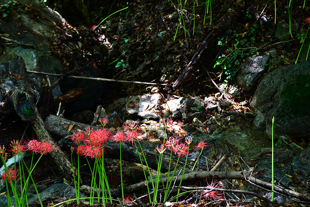 용천사 천왕문에 이르면 왼편으로 꽃무릇 군락지가 펼쳐집니다. 깊은 계곡을 따라 붉게 피어난 꽃무릇은 더욱 진한 빛깔로 다가옵니다. 일찍 도착한 사진 동호회 회원들이 그 아름다움을 담느라 분주한 모습입니다. 저 역시 꽃무릇의 붉은 매력을 카메라에 고스란히 담아봅니다