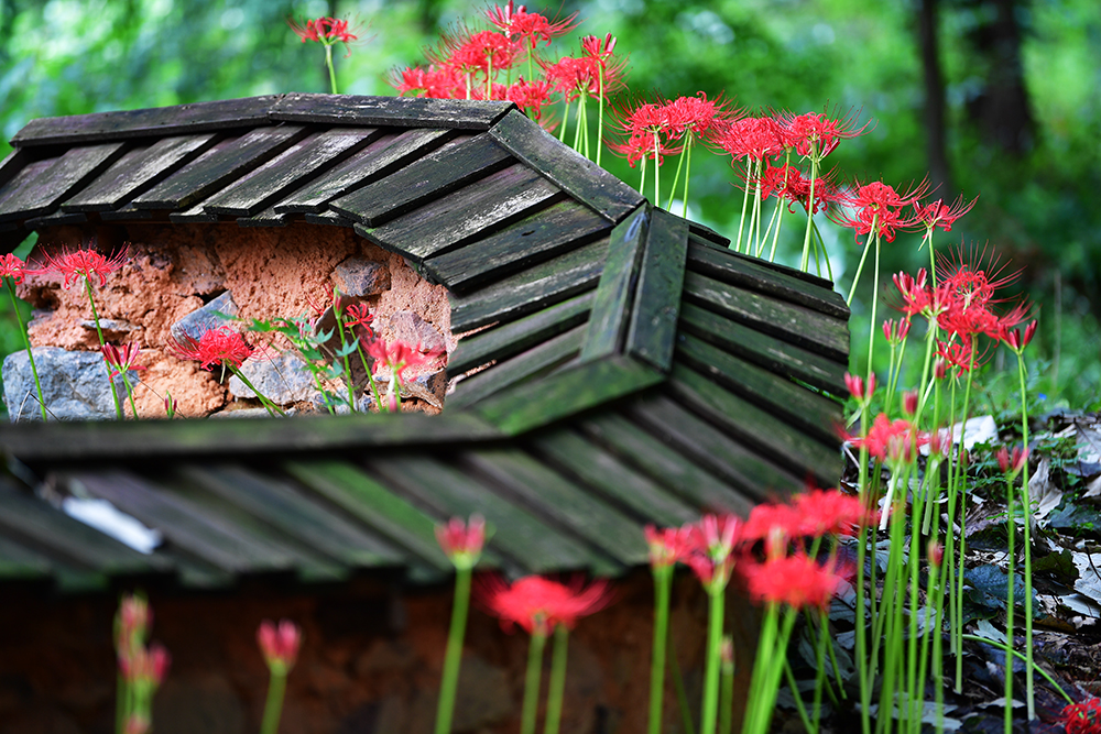 일주문을 지나 용천사 길목에 들어서면, 양옆으로 붉은 꽃무릇이 반갑게 맞아줍니다. 만개한 것은 아니지만, 고창 선운사의 풍경보다 훨씬 더 풍성하게 피었습니다. 눈길을 끄는 것은 길 양옆으로 이어진 너와지붕을 얹은 낮은 돌담입니다. 담벼락을 따라 붉게 물든 꽃무릇이 어우러진 모습이 참으로 운치 있고 아름답습니다.