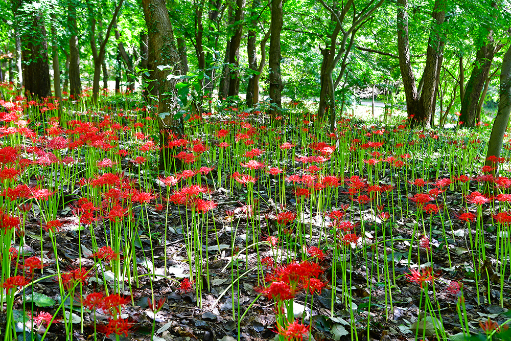 지장전을 끝으로 용천사 산책을 마치고 나옵니다. 돌아갈 때는 사천왕문 아래쪽 길을 택해 주차장으로 내려가 보기로 했습니다. 이 쪽에도 꽃무릇 군락지가 펼쳐져 있는데, 위쪽 길보다 훨씬 더 풍성하게 피었습니다. 아직 만개한 것은 아니지만, 지금 모습만으로도 꽃무릇의 매력을 충분히 즐기기에 모자람이 없습니다.