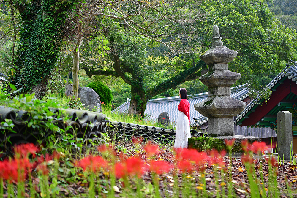 천불전 앞에 서니 대웅보전 우측으로 멋진 석탑과 석등이 눈에 띕니다. 석등과 석탑이 나란히 서있는 모습이 오래된 사찰의 깊은 품격을 전해줍니다. 그 곁으로 붉게 피어난 꽃무릇이 어우러져 한층 더 아름다운 풍경을 만들어내니, 그냥 지나칠 수 없습니다. 전속 모델을 앞세워 그 순간을 한 컷 담아봅니다