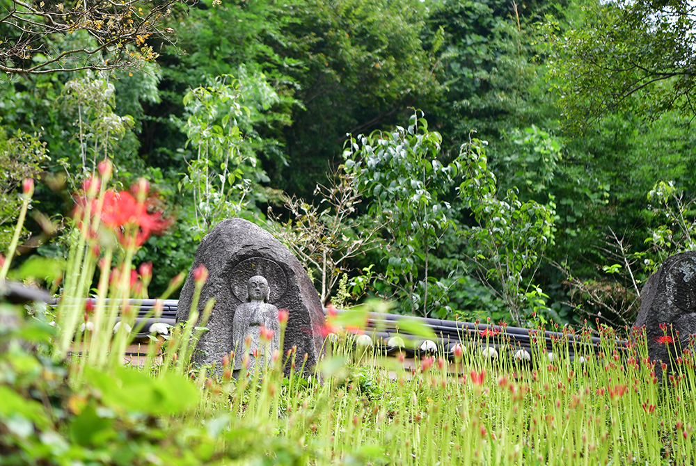 석등과 석탑 아래에는 지장전이 자리하고 있습니다. 지장전 앞마당에 서니 꽃무릇에 둘러싸인 석불이 고요히 앉아 있는 모습이 눈에 들어옵니다. 붉은 꽃들 사이에 자리한 석불은 한층 더 경건하게 느껴집니다. 다만 꽃무릇이 아직 만개하지 않아 못내 아쉬움이 남습니다.
