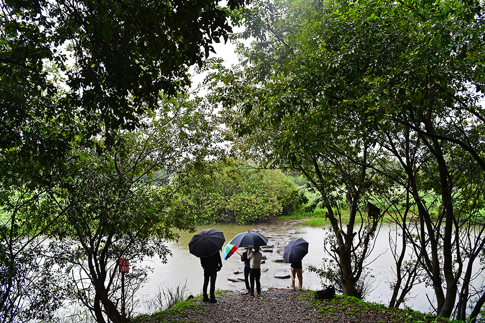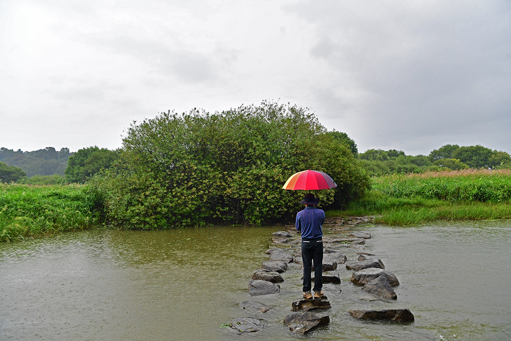얼마쯤 걸어가니 징검다리가 눈앞에 나타났습니다. 건너고 싶은 마음이 굴뚝같았지만, 비로 인해 불어난 물 때문에 발길을 멈출 수밖에 없었습니다. 그 순간, 지인이 징검다리 위에서 우산을 들고 포즈를 취해 주었는데, 그 모습이 재밌고 정겨워 한 컷 사진으로 담아봅니다. ^^