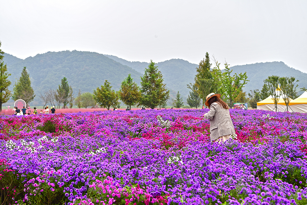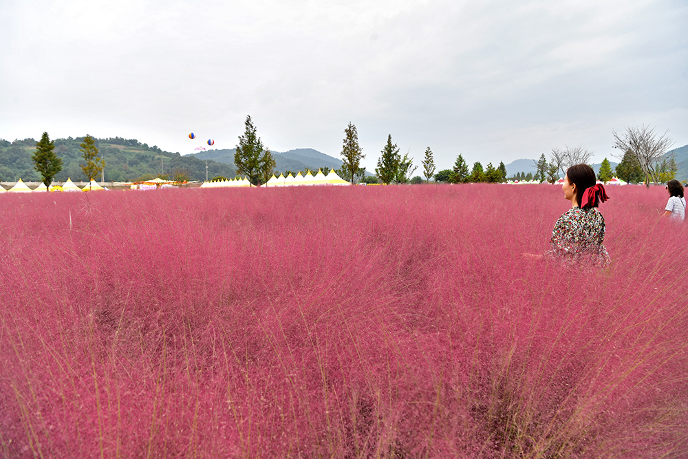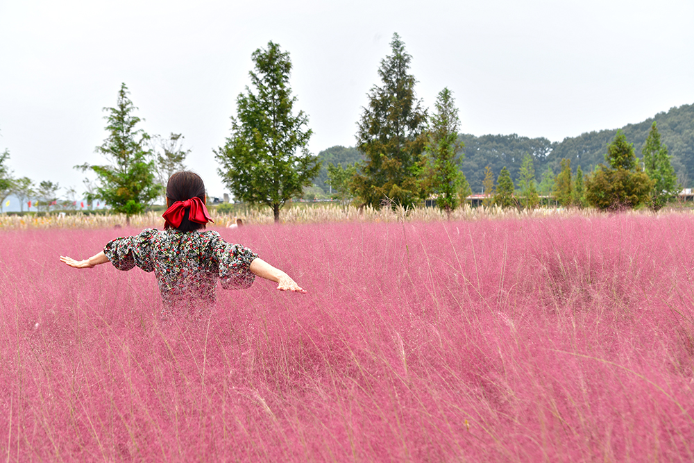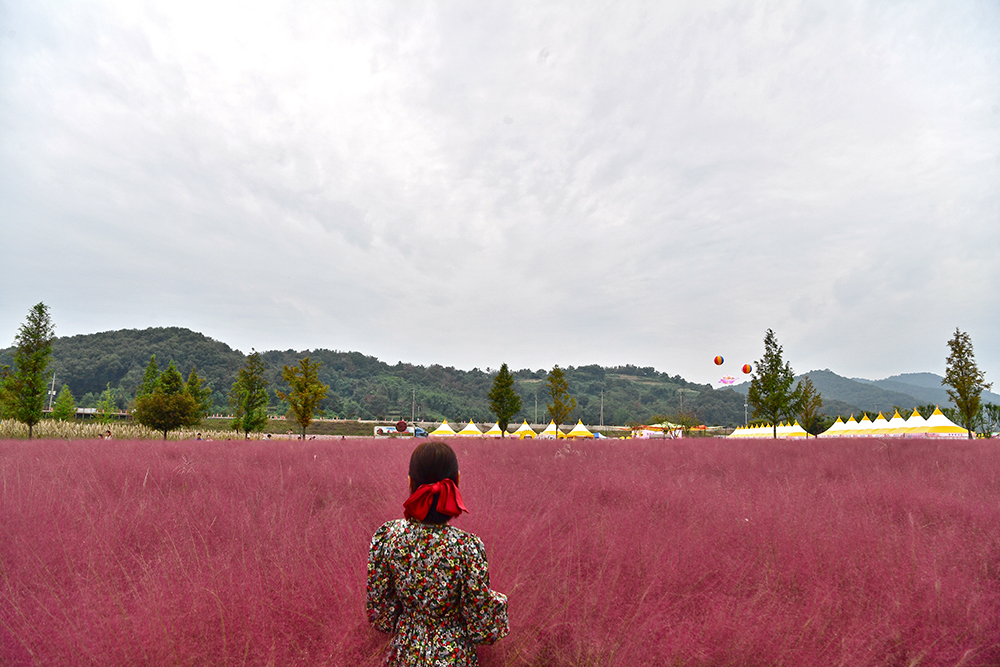 노란 전망대 앞으로 핑크뮬리 군락지가 광활하게 펼쳐져 있습니다. 흐린 날씨 탓에 핑크빛이 조금은 짙고 어둡게 보이는 게 아쉽지만, 그래도 사진으로 담기에는 충분히 아름답습니다. 전속 모델과 함께 핑크빛 물결 속을 걸으며, 연휴의 여유로움을 한껏 즐겨봅니다.