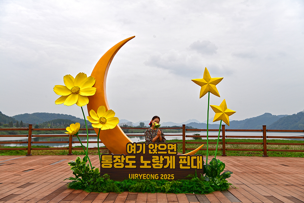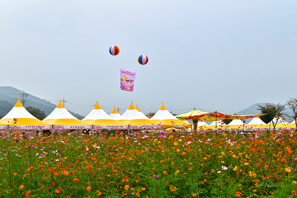 주차장을 나와 모퉁이를 돌자, 그야말로 장관이 펼쳐집니다. 끝이 보이지 않을 만큼 넓게 펼쳐진 황화코스모스 군락지가 시야를 가득 메웁니다. 안내판의 '2025 의령 기강 리치 꽃축제'라는 문구가 눈에 들어옵니다. 그제야 꽃축제가 열린다는 사실을 알았습니다. 그래서인지 예년보다 훨씬 넓고 잘 정비된 느낌입니다. 하늘 위에 떠 있는 축제 홍보 애드벌룬을 바라보며, 노란 코스모스 물결 속을 천천히 걸어봅니다.