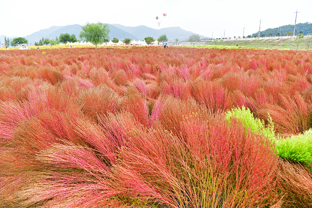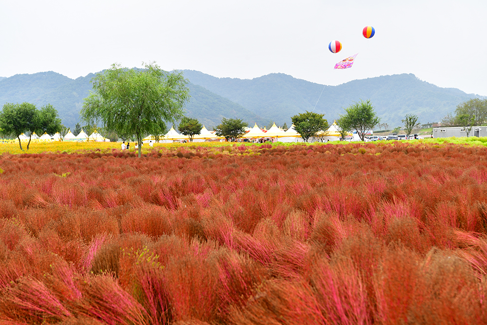 핑크뮬리 군락지를 지나자 이번에는 붉게 물드는 댑싸리 군락지가 모습을 드러냅니다. 재미있는 포토존과 예쁜 포토존이 새롭게 꾸며져 있어 눈길을 끕니다. 의령군에서 이번 축제를 위해 얼마나 공들였는지 한눈에 느껴집니다.