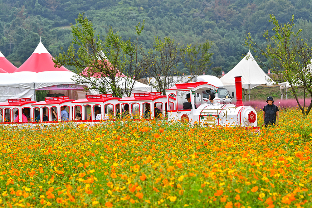꽃 축제장을 돌아다니다 보면 재미있는 열차들을 만날 수 있습니다. 하나는 ‘댑싸리 꽃기차’이고, 또 하나는 이름을 알 수 없는 흰 기차입니다. 그 모습이 정말 귀엽고 사랑스럽습니다. 남녀노소 누구나 이용할 수 있어, 드넓은 축제장을 구석구석 즐겁게 돌아볼 수 있을 것 같습니다. 특히 흰 기차가 예쁜 꽃 군락지와 어우러진 풍경은 사진으로 담아도 참 예쁘더군요.