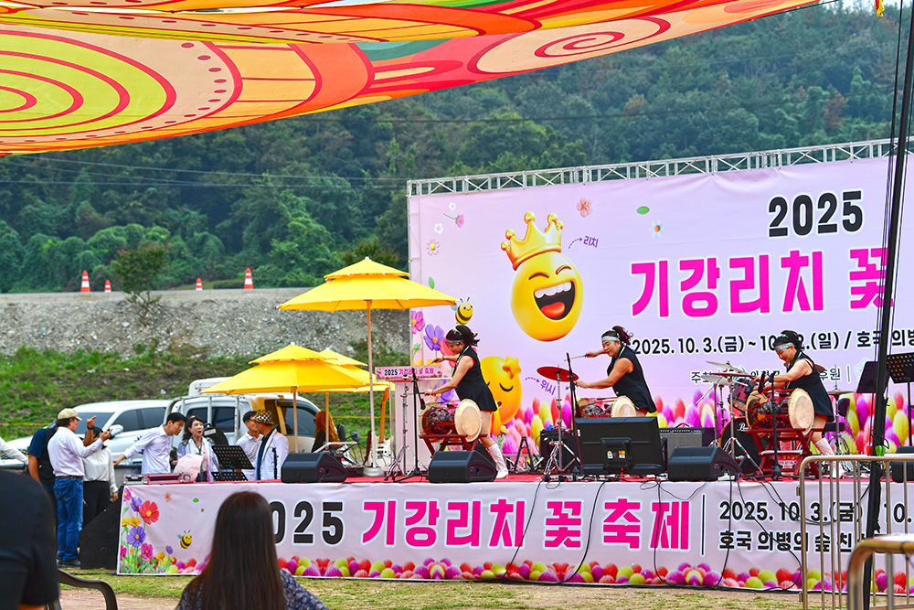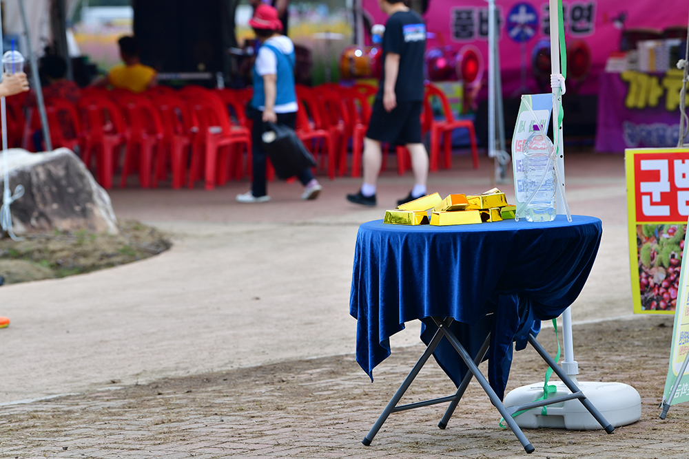 꽃 군락지를 둘러본 뒤, 축제장 쪽으로 발걸음을 옮겼습니다. 어디선가 들려오는 풍악 소리에 절로 마음이 들썩입니다. '부자의 길'을 지나니 금덩어리로 유혹하는 부스가 눈에 들어옵니다. 무대에서는 장구 공연이 한창 펼쳐지는데, 절로 어깨가 들썩거려집니다.ㅎ