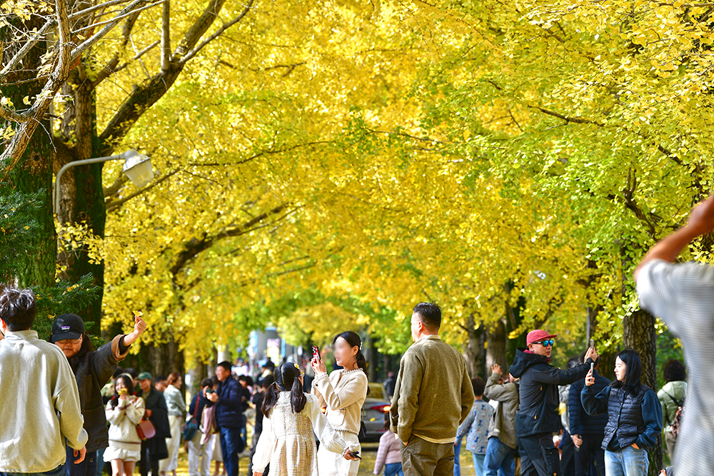 은행나무길의 끝 지점에 도달해 잠시 숨을 고른 후, 다시 입구 쪽으로 되돌아갔습니다. 되돌아가는 길 역시 황홀한 아름다움을 선사합니다. 그 짧은 시간 동안에도 방문객이 눈에 띄게 더 늘어나, 이 명소의 인기를 다시 한번 실감했습니다.