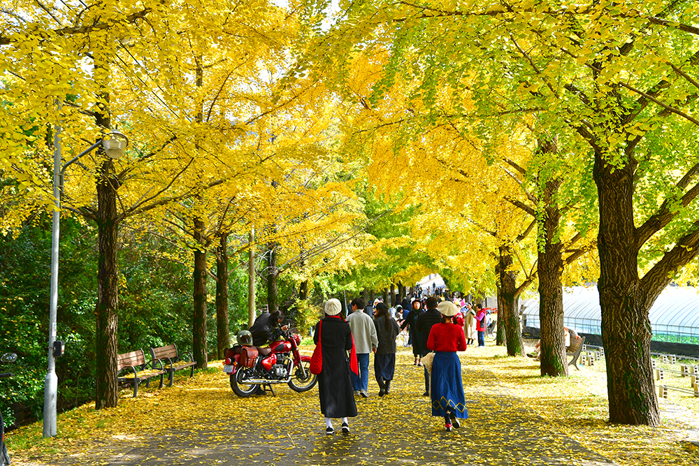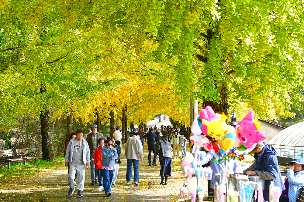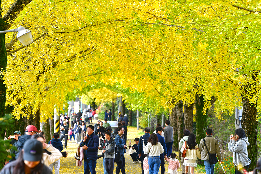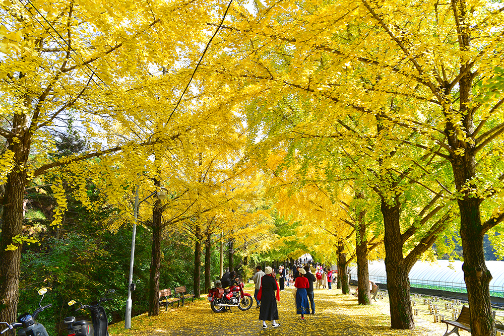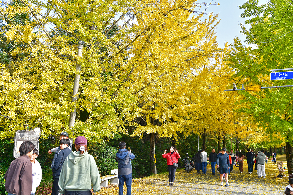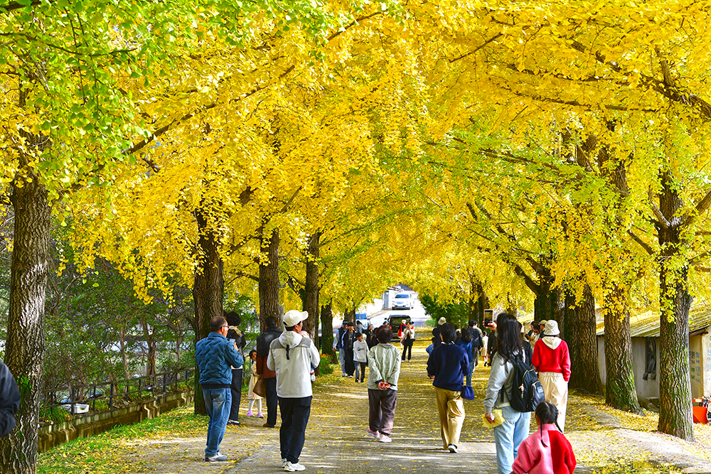 마을 입구에 들어서자, 2차선 도로를 완전히 뒤덮은 은행나무 행렬이 한눈에 들어오며 장관을 이루었습니다. 입구에서부터 이미 황금빛으로 물든 은행나무와 함께 가을을 만끽하는 여행객들로 북적였습니다