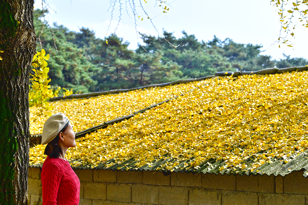 노란 은행나무 길을 걷다 보니, 중간 지점에서 많은 분들이 줄 서 있는 모습이 눈에 띄었습니다. SNS에서 '인생샷 성지'로 뜨겁게 소개되었던 그 핫플레이스입니다. 오래된 슬레이트 지붕 위에 소복히 쌓인 노란 은행잎을 배경으로 사진을 담을 수 있습니다. '전속모델'을 앞세워 이 황홀한 노란 가을을 사진 속에 담아봅니다.