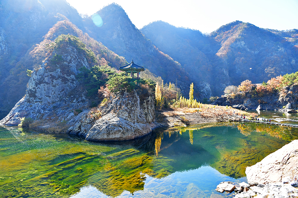 미루나무 단풍을 만끽한 후, 월류봉 전망대에 도착했습니다. 북적이는 인파를 피해 늦가을의 월류봉을 카메라에 담아봅니다. 특히 맑은 강물 위로 노란 미루나무가 투명하게 비치는 반영이 정말 인상적입니다. 보고만 있어도 마음이 맑아지는 기분입니다. ㅎㅎ
