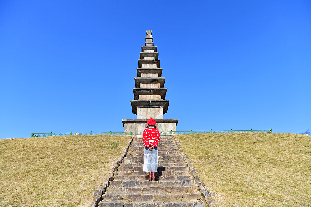 중앙탑은 12.95m에 달하는 높이에 비해 폭이 좁아 날렵하고 가늘게 치솟은 인상이 강하지만, 하늘로 시원하게 뻗어 나가는 기세가 돋보입니다. 웅장한 높이감을 제대로 담아보고자 '전속모델'을 탑 앞에 세워봅니다. 거대한 석탑과 나란히 선 모델이 어우러져, 재미있는 장면이 연출되었네요. ㅎㅎ