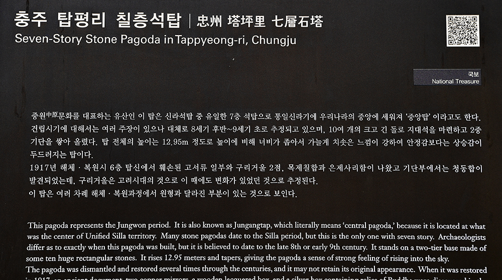 충주 중앙탑, 정확한 명칭인 ‘충주 탑평리 칠층석탑’은 현재 국보 제6호로 지정되어 관리될 만큼, 역사적 가치가 매우 높은 석탑입니다. 무엇보다 국토의 중심이라는 상징성이 더해져, 중원(中原) 문화를 대표하는 유산으로 자리 잡았습니다. 충주를 여행하신다면 중앙탑에서 천년의 세월을 버텨온 당당한 위엄과 당시 충청인들이 가졌던 깊은 자부심을 함께 느껴보시길 바랍니다. ㅎ