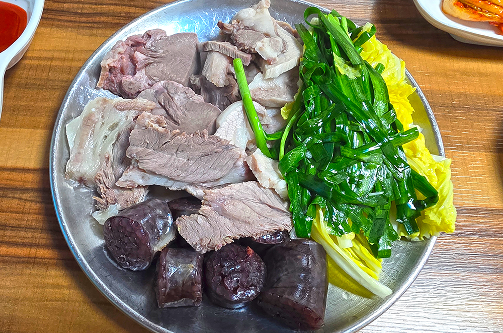 국밥이 나오기도 전, 에피타이저라고 하기엔 너무나 융숭한 대접입니다. 생각지 못한 선물 같은 상차림에 마음이 먼저 일렁입니다. 우선 눈으로 이 풍성함을 즐긴 뒤, 순대 한 점을 집어 봅니다. 두툼한 수육 곁에서 붉은 자태를 뽐내는 순대를 막장에 푹 찍어 입에 넣으니, 쫄깃한 식감 뒤로 밀려오는 구수한 풍미가 참으로 정겹습니다.ㅎ