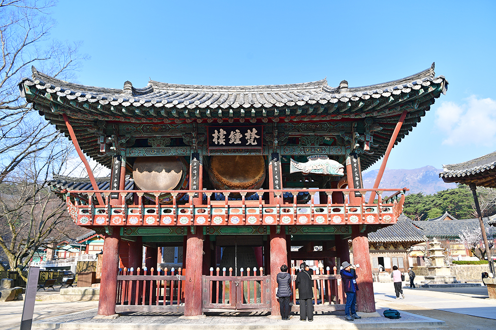 극락보전 맞은편, 2층 규모의 범종루(梵鍾樓)가 자리합니다. 종과 북, 목어, 운판이 함께 있는 이곳은 사찰의 하루를 여닫는 소리의 중심입니다. 숲과 계곡을 타고 번지는 은은한 종소리를 상상하며 걷다 보니, 마음속 번뇌도 함께 씻겨 내려가는 듯합니다.ㅎ