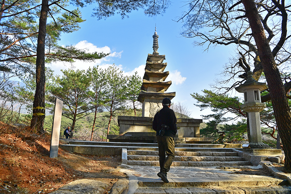 통도사 경내 남쪽, 작은 언덕인 '사자목'으로 향합니다. 작은 돌다리를 건너 나지막한 언덕을 오르면 통도사의 전경을 조망할수 있습니다. 이곳에는 신라 말에서 고려 초의 양식을 간직한 오층석탑이 서 있습니다. 1991년에 복원된 탑이지만, 그 단단한 기품은 여전합니다. 석탑을 천천히 음미한 뒤, 발아래로 펼쳐진 통도사의 고즈넉한 전경을 카메라와 눈에 가득 담아봅니다.