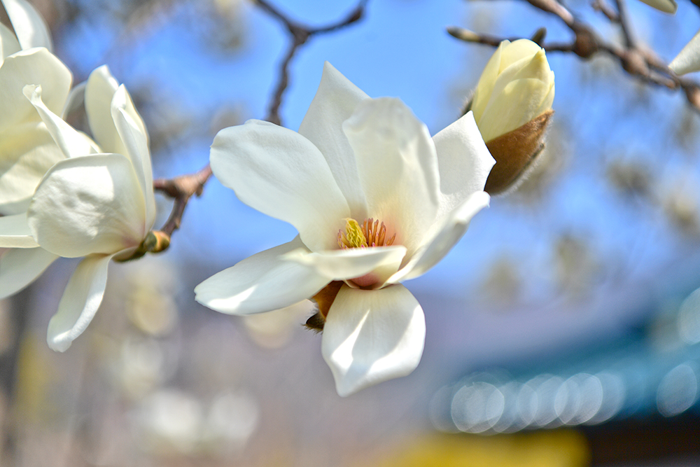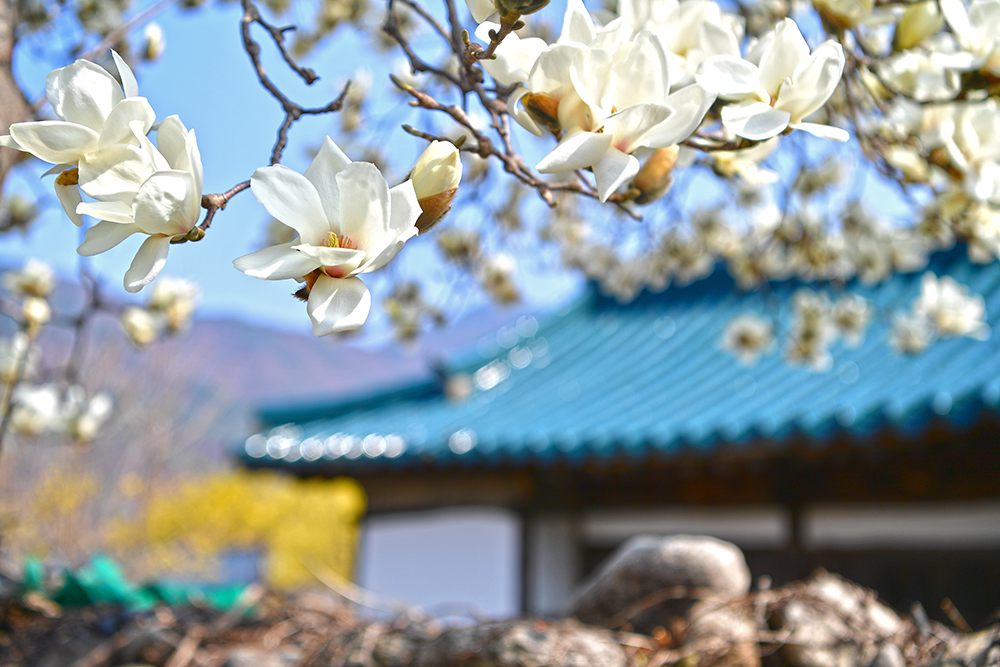 한밤마을 돌담길의 노란 산수유 곁에는 순백의 목련이 단아하게 피어 있습니다. 돌담 위로 수줍게 고개 내민 목련의 하얀 꽃망울이 참으로 이채롭습니다. 산수유와는 또 다른 매력으로 마을을 환하게 밝히는 목련의 자태를 렌즈에 담아봅니다.