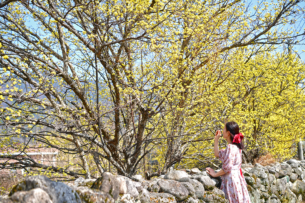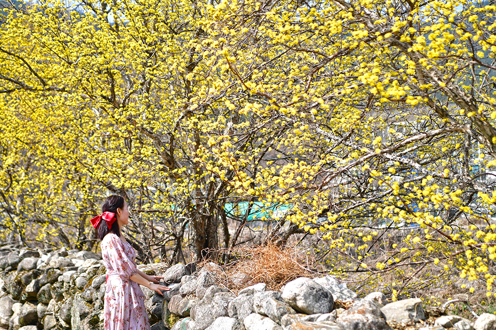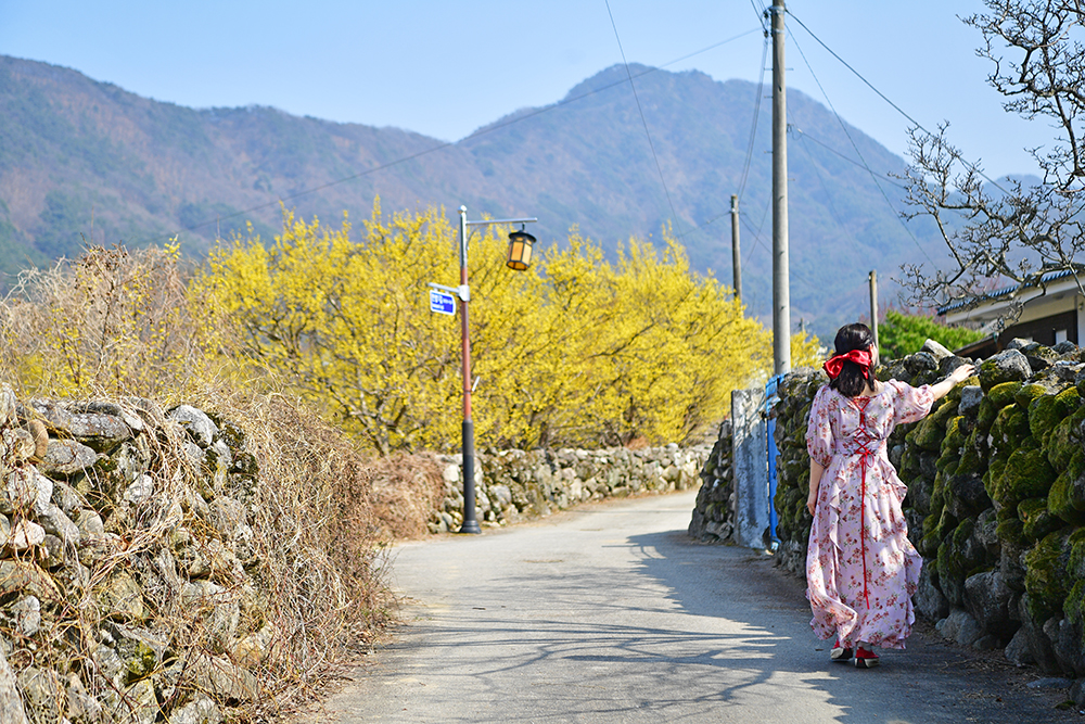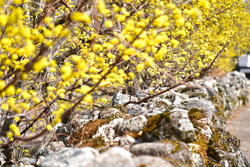 고즈넉한 돌담 사이로 고개를 내민 노란 산수유가 발걸음을 멈추게 합니다. 지역의 숨은 산수유 명소답게, 한밤마을의 봄은 따스한 빛깔을 띠고 있습니다. 투박한 돌담과 가녀린 꽃가지가 빚어내는 이색적인 조화. 그 찰나의 아름다움을 연신 담아봅니다