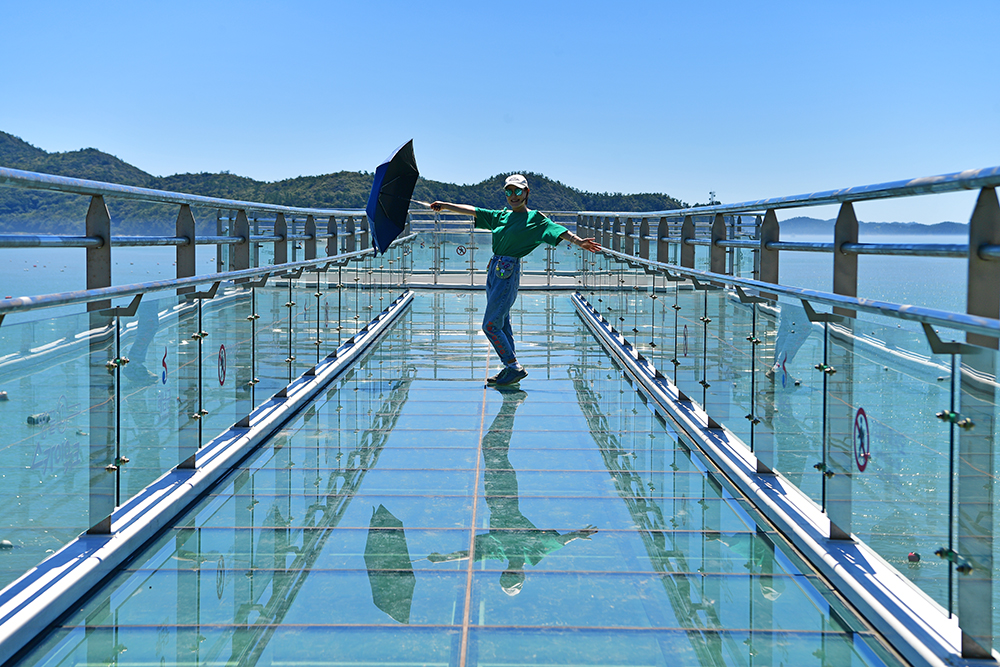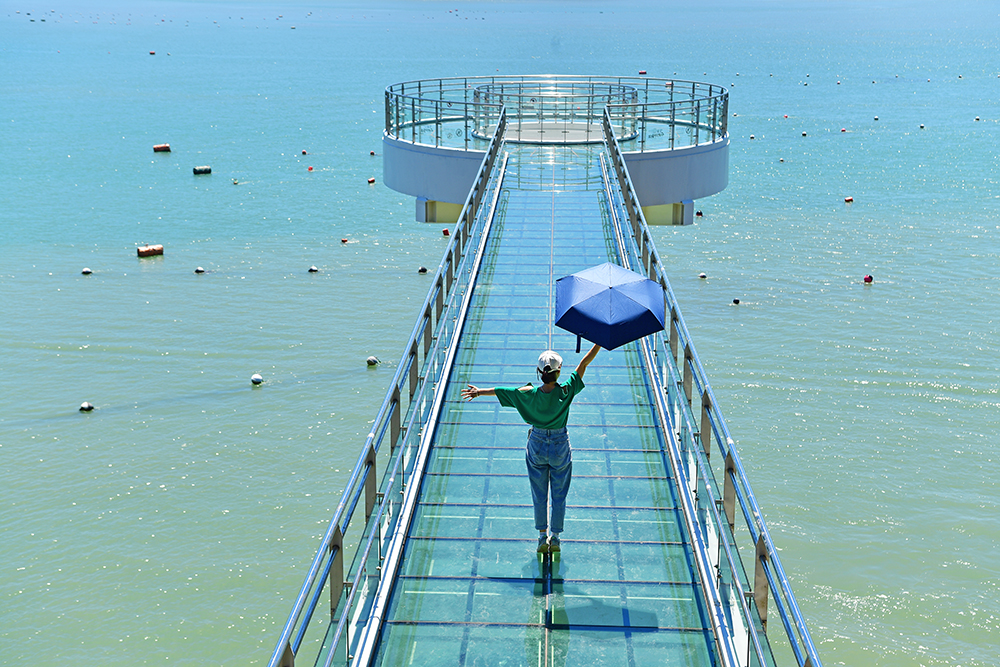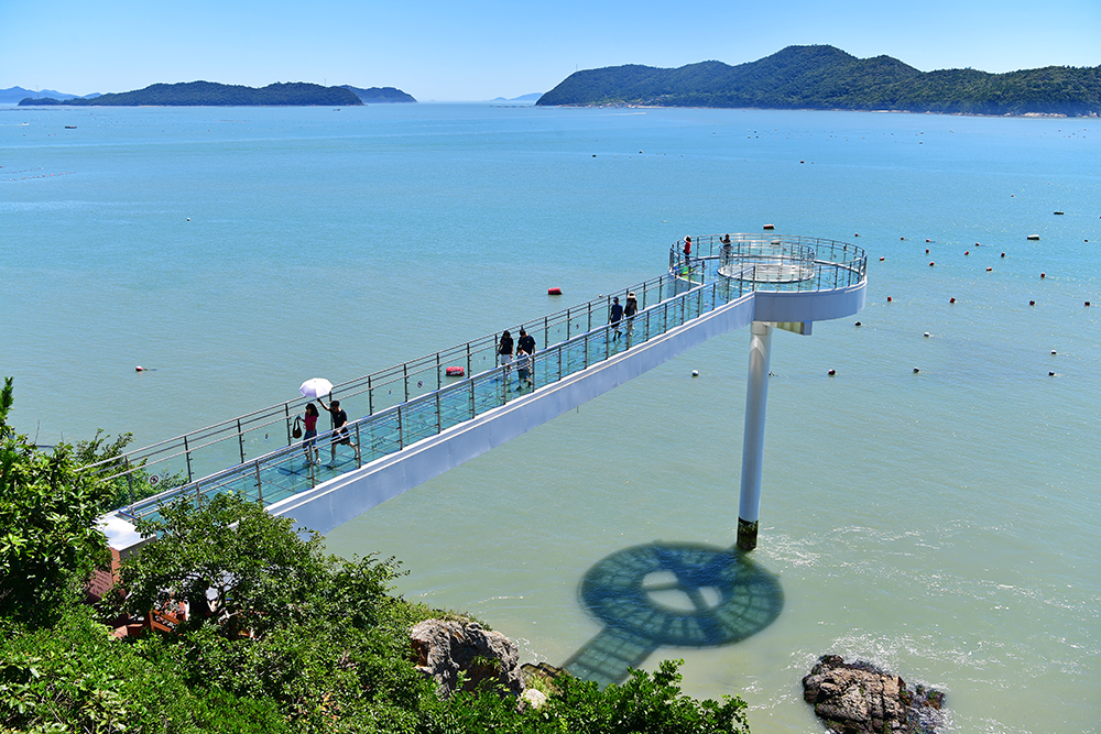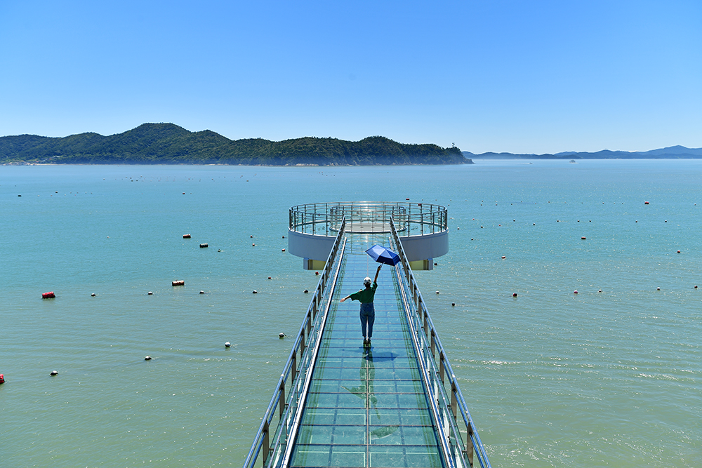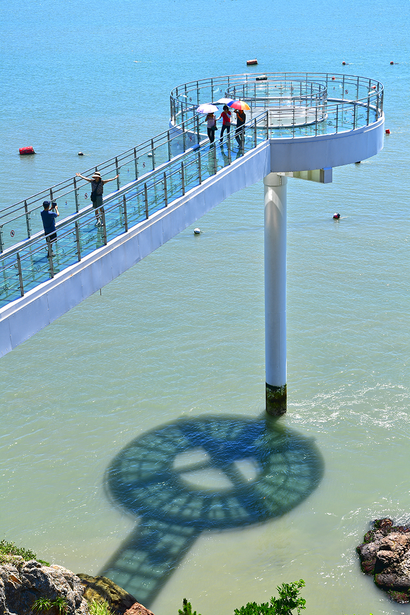 마침 방문객들이 잠시 뜸해진 틈을 타, 전속 모델을 내려보냈습니다. 뜨거운 햇볕을 피하려고 챙겨온 양산이 의외로 멋진 소품이 되어, 스카이워크 위에서의 분위기를 한층 살려 줍니다. 덕분에 바다와 어우러진 사진이 더 생동감있어 보입니다.