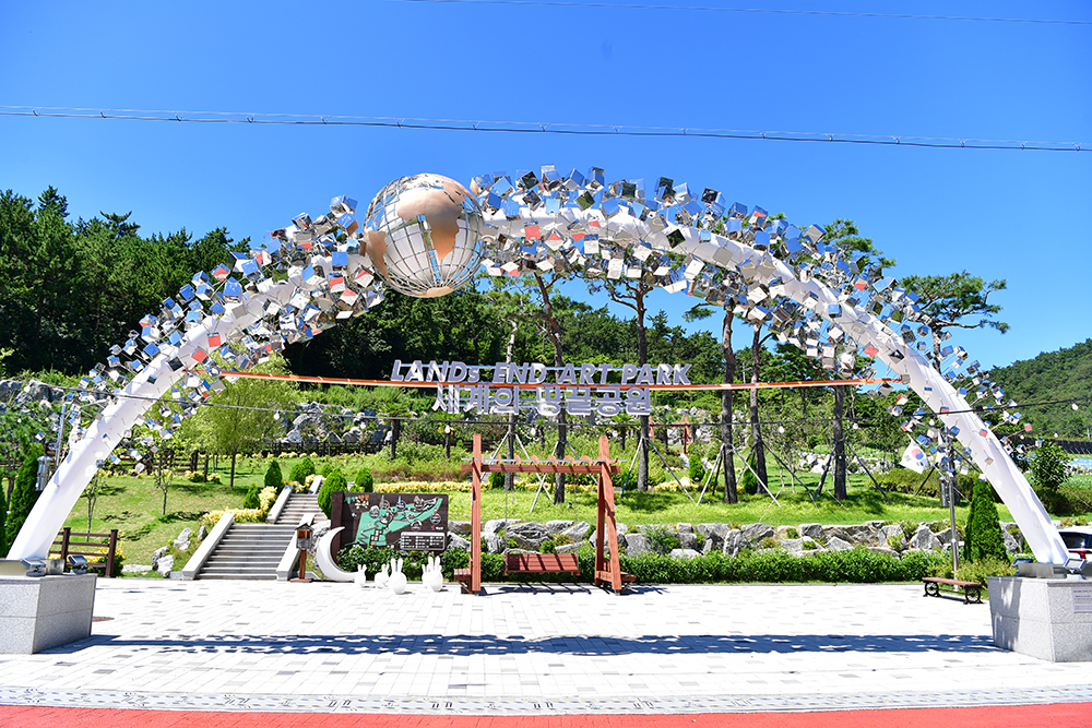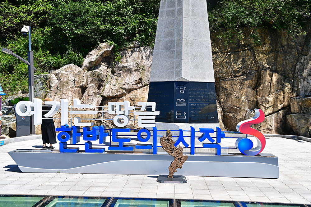 드디어 땅끝탑에 도착했습니다. 인증샷을 담으려는 여행객들로 조금 붐비지만, 차례를 기다리며 주변을 살펴봅니다. 그때 눈길을 사로잡는 것이 땅끝탑 앞 조형물입니다. '여기는 땅끝, 한반도 시작'이란 문구와 함께 한반도 지형을 거꾸로 설치해 놓았습니다. 땅끝을 단순한 '끝'이 아닌, 거꾸로 뒤집어 '새로운 시작'을 의미하는 역발상 아이디어가 돋보입니다. 참 멋진 표현이라 절로 흐뭇해집니다. ㅎ